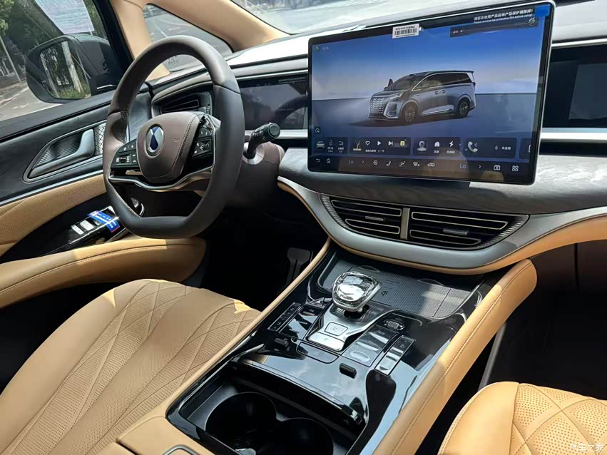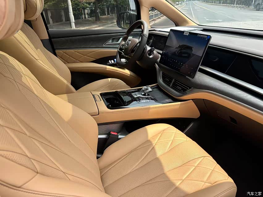 整车NAPPA真皮包裹,触感细腻,档次感一下就上来了,15.6英寸中控大屏显示清晰,操作顺滑,车机搭载超智能交互系统,配合专属的定制车机芯片,支持AI智能体、智慧问答功能,语音交互覆盖前中后三排六个音区,识别精准,说一声打开天窗,导航去公司,立马响应,方便又安全。方向盘从触控变成实体按键,手感更好,不容易误操作。