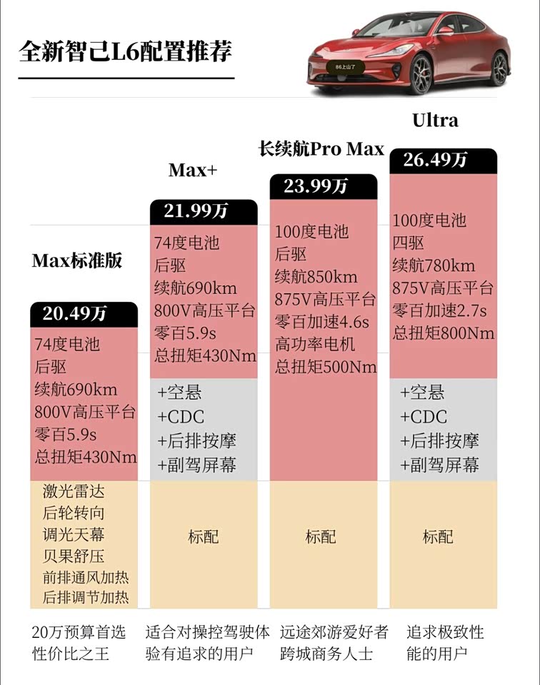 真香警告,入门才20万起,但这配置堆得丧心病狂!激光雷达、英伟达Orin芯片、四轮转向、空悬(高配)、全铝底盘、800v台,同价位你看看别人?连BBA的丐版都比这贵一截,配置还没它一半多。智驾方案、高阶舒适性配置基本标配,后期订阅也透明。跟它自己大哥比,L7贵的那些钱多出的豪华感,L6这配置和性能完全给补回来了,只能说:掀桌子选手,真香!
