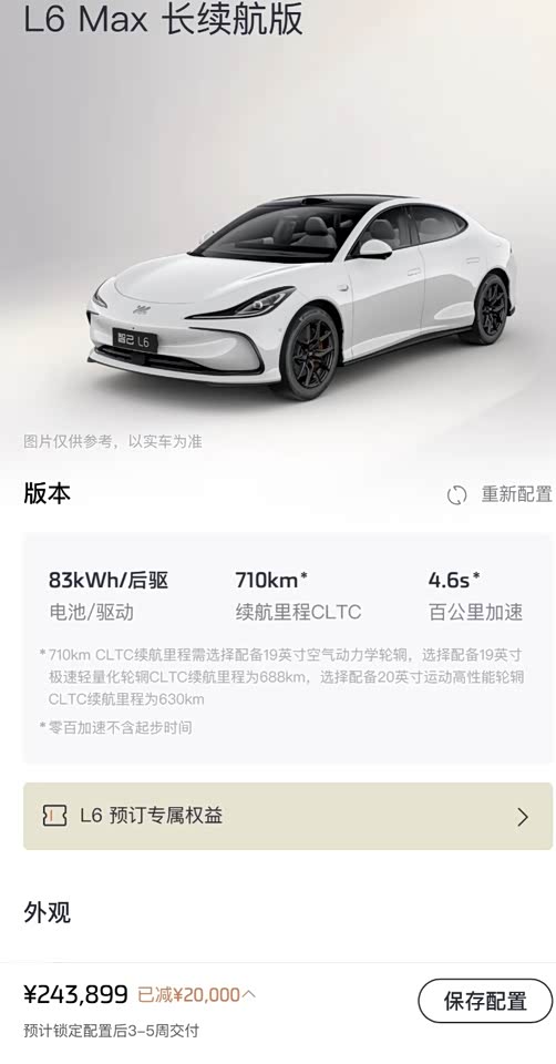 两个字,帅气,不失优雅。智己L6这颜值妥妥的轿跑界纯欲风!低趴鲨鱼头配闪电大灯,白天像液态金属子弹,晚上贯穿式灯带一甩——嚯,整条街就属你最赛博!溜背线条从B柱唰地溜到小翘臀,性感但一点都不油腻。最绝是那个掀背尾门,开盖瞬间像变形金刚蹲马步,轮毂里还藏橙色卡钳骚色,连我小区保安都问:“这车得百八十万吧?”建议路上开慢点,怕路人拿手机拍你车被追尾啊喂!