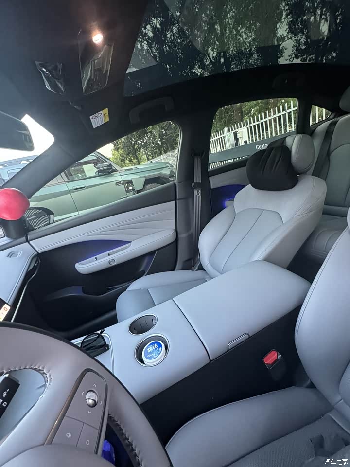 因为我们选的是Max版本,类似的屋顶是麂皮的整车看上去很有质感,沙发也是真皮座椅颜色是有两个的,我们选的是淡雅灰内饰