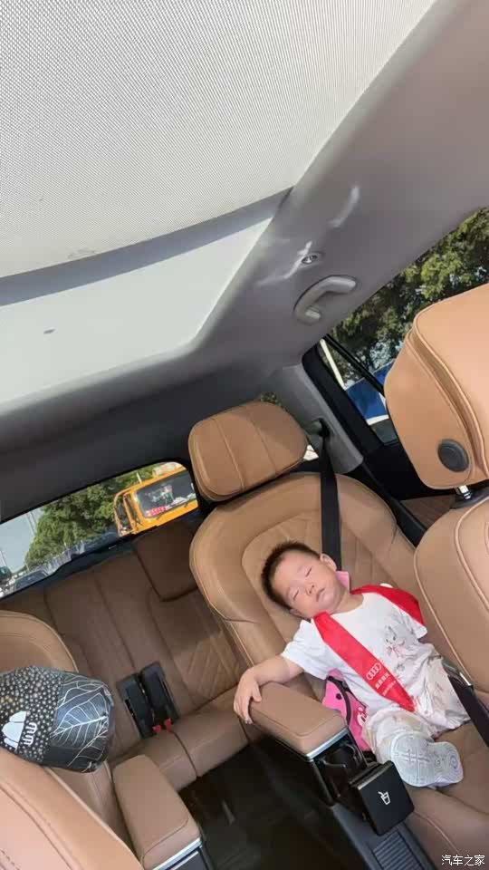 这是还没安装儿童座椅的时候,小宝独自坐在二排上睡觉,有大老板的气质。