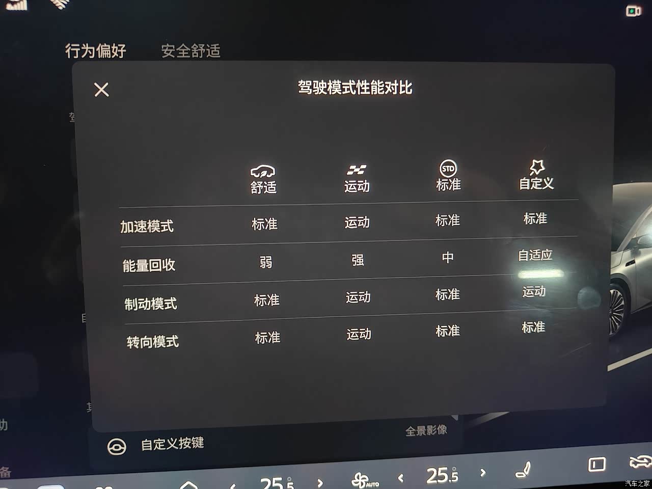 驾驶感受 分为舒适 标准 运动3种驾驶模式 还可以自定义 一定要体验体验舒适模式 感觉很不一样 平时开还是标准或自定义 因为可以动能回收 运动模式在长途驾驶中可以开启 动能回收较强 加速也很快 需要适应适应