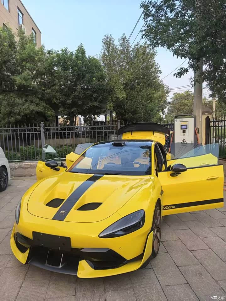 先来说说动力,一脚电门下去,那种强烈的推背感直接把我按在座椅上,心跳瞬间飙升, 加速又快又稳,后段也不会掉链子,在专业场地体验的时候真的太震撼了!日常驾驶切换到舒适的模式,在市区的道路里穿梭也是很轻松,不会觉得动力太过猛烈。 底盘的调校也很棒👍,过弯的时候支撑性也很好,车身侧倾的也非常小,转向也精准,指哪打哪。碳陶刹车也很给力,制动力很强,而且连续刹车也不会有明显的减弱,不管是日常驾驶还是偶尔加速,都给足了我安全感。低低的车身加上流畅的线条,我还加了挖孔,提高了稳定性,更上了颜值巅峰,感觉有满满的战斗气息,开在路上回头率爆, 它的碳纤维车顶不仅好看,还能减重,进一步的提升操控性能。颜色方面选择也很多,每一款都很帅,我选的这个颜色在阳光下也特别炸眼。车内用了碳纤维和翻毛皮吧,摸起来质感直接拉满啦,座椅坐着也舒服,而且长时间的开车也不会觉得累。它的中控台设计简洁大方,7寸的全液晶仪表加上16寸的中控大屏,操作非常的流畅。环境氛围灯晚上打开也是氛围感十足,超级喜欢,还能根据不同的驾驶模式和音乐节奏还能自动变化,帅 。还有小爱同学,反应超快,准备配个机器人了,导航或者放音乐调节空调这些操作动动嘴就能搞定,手机和车机还能无感互联,几乎是没有延迟,用手机也能远程控制车辆,提前打开空调或者查看车辆状态啥的,太方便了。智驾方面的它也是变道果断,虽然方向盘在智驾时对手的位置有要求但习惯了也行。我这台官方写的纯电续航是630公里,实际也就跑到560左右吧,日常一周充一次电完全够,近期出门跑了一次高速,续航大概能达到450公里左右,再加上充电速度快,用快充桩一会儿就能充不少电了,所以并没有续航焦虑,如果能再提升一下续航就更完美啦。对比同价位的其他车型,小米SU7Ultra真的很棒,配置即刻拉满了,很多在其他车上需要选装的配置,它都直接标配了,很良心👍