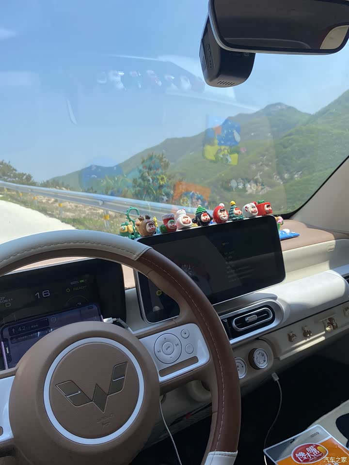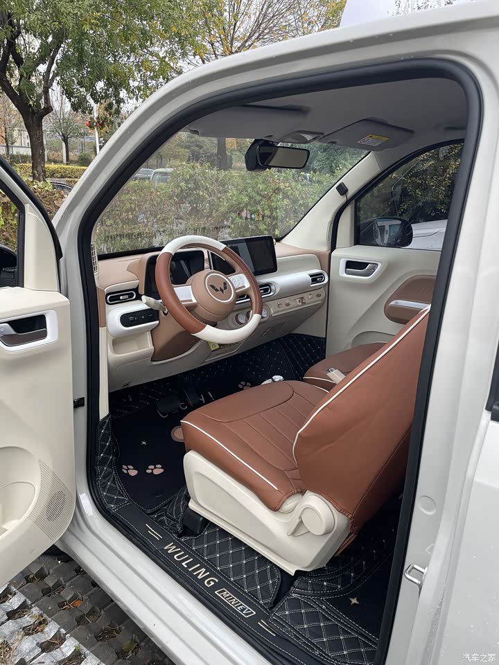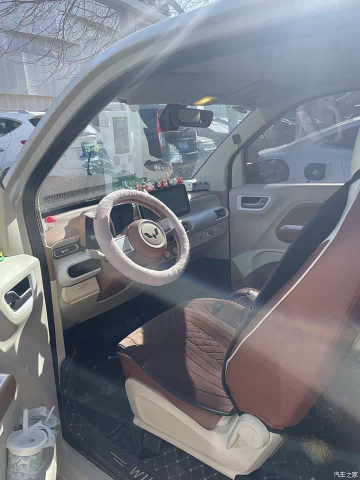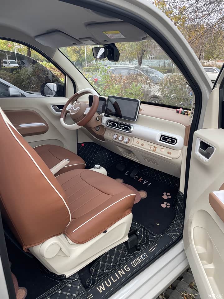 内饰的设计简洁大方,整体风格与外观相呼应,同样走的是可爱路线。用料方面中规中矩,毕竟受价格限制,不能期望有太高级的材质。内饰的布局合理,各种功能按键操作起来比较方便,日常使用还是很顺手的。我买的青春版是不带中控屏的,我这款是自己后安装的,经济实惠。但是浅色的中控台在强光下确实反光严重。
