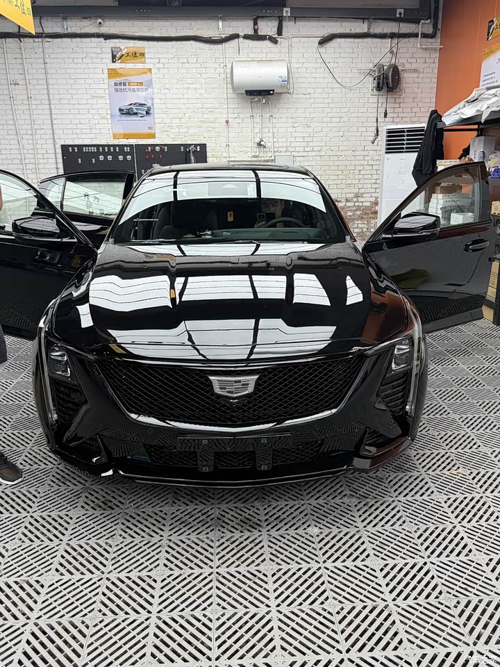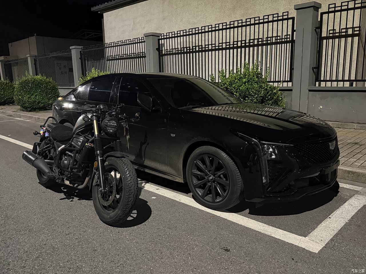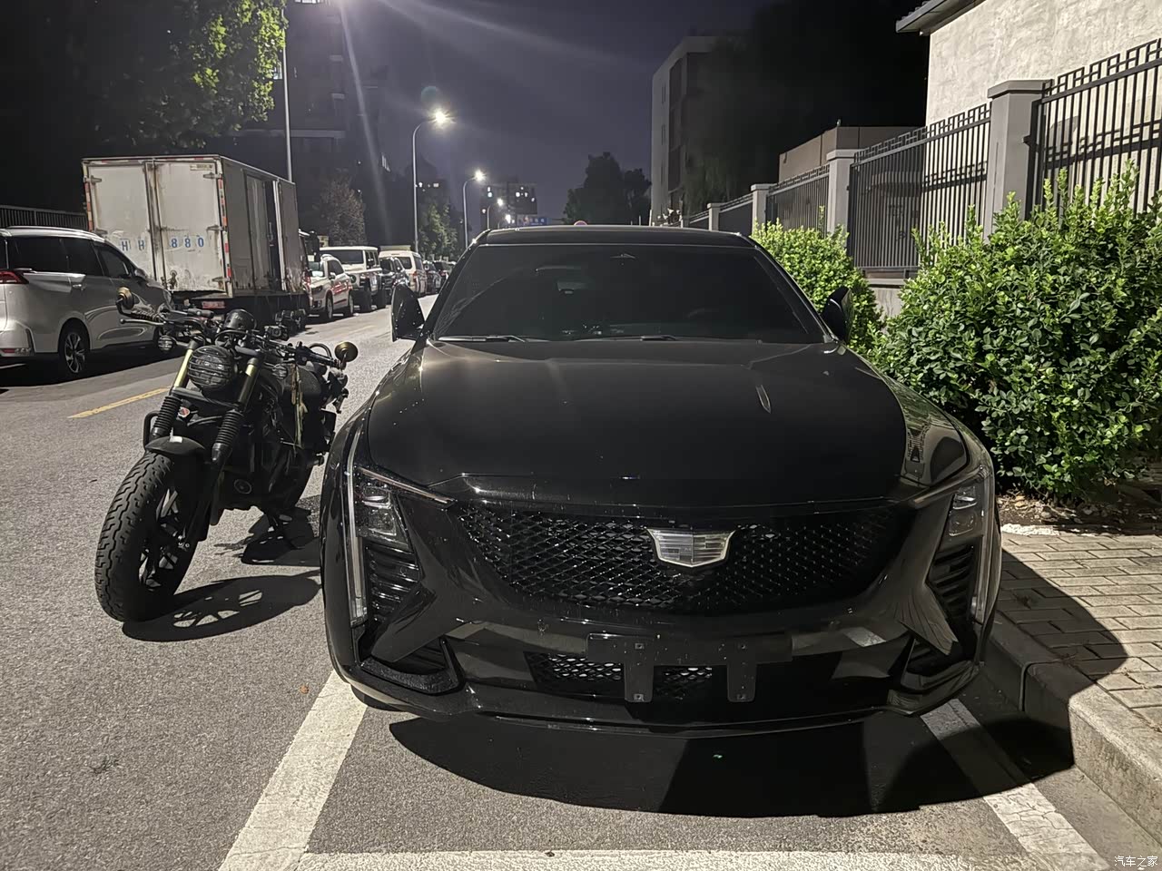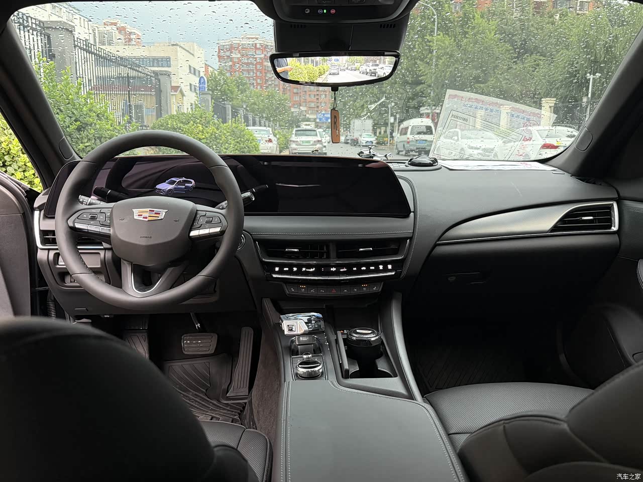 外观上,我选的是黑内黑外的,这个颜色尽显高贵,在路上回头率超高,辨识度拉满。车身整体延续了凯迪拉克家族经典的钻石切割工艺,线条硬朗且流畅,溜背式车身搭配上直列式闪电车灯,豪华与运动感完美融合。赛道性能版专属的龙鳞格栅相比城市运动版的 V 盾格栅,攻击性更强,视觉冲击力十足。亮黑色后视镜、黑色多幅式轮毂以及黑色运动侧裙的搭配,营造出一种低调奢华的运动氛围。车尾部分,竖条状的尾灯进行了黑化处理,下方新增的与车身同色扰流板、运动小护杠和排气装饰罩,不仅提升了运动感,还让车尾看起来更加饱满、有层次感。车辆长宽高分别为 4930 毫米、1883 毫米、1453 毫米,轴距达 2947 毫米,这样的尺寸让整车看上去大气稳重,同时也保证了车内空间的宽敞。