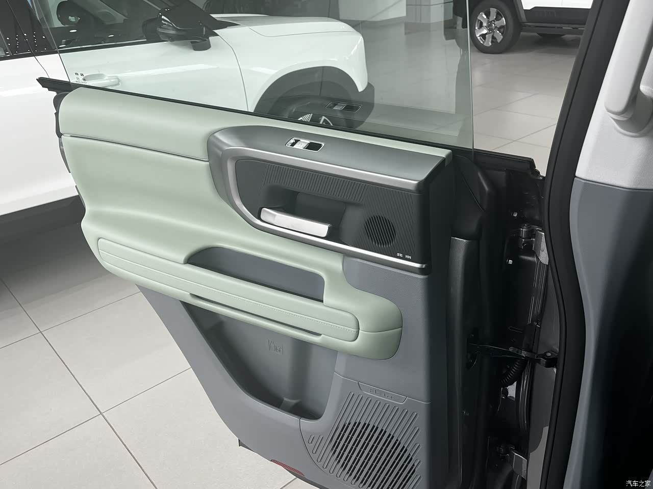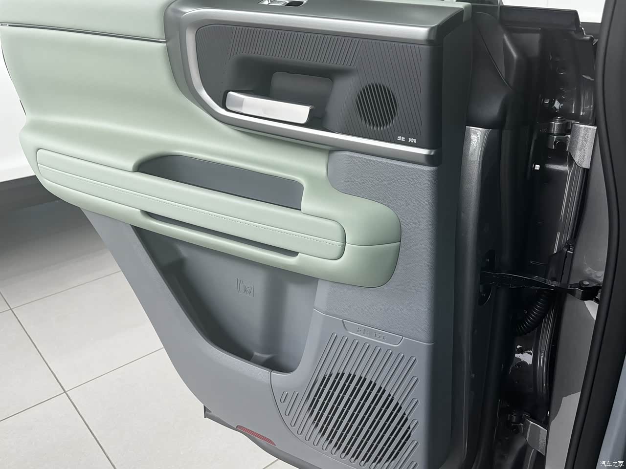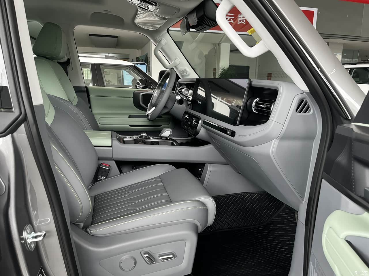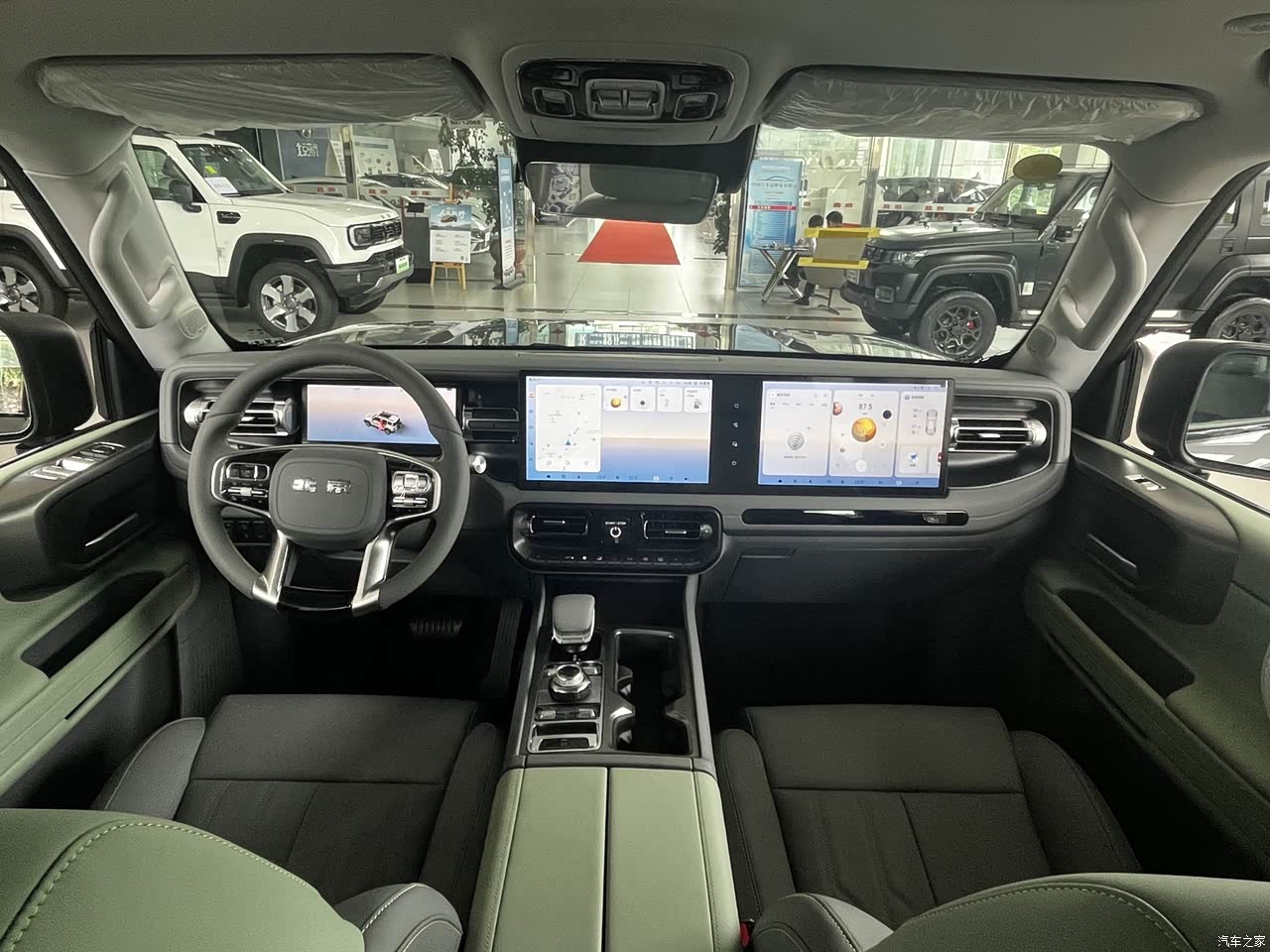 内饰:粗犷有余,精致程度有待提升 坐进车内,BJ40的内饰风格与外观高度统一,大量平直线条、粗壮的扶手,一个字硬!用料方面,中控台顶部和门板部分区域使用了软性薄皮包裹,看起来不错,但触感略微有点硬,尤其是副驾驶前方区域,敲击声比较明显。不过好在看起来皮质纹路清晰,全液晶仪表盘和大尺中控屏的加入,确实让整个车厢的科技感提升了一个档次。