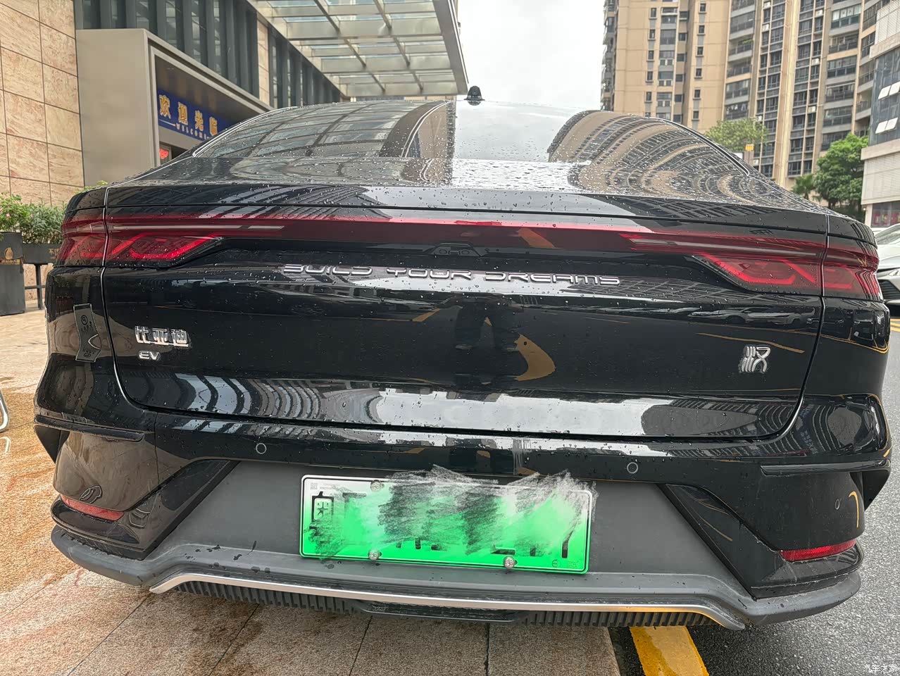 前脸特别大气,尤其是那个贯穿整个车头的大灯带,解锁车子或者晚上开车的时候,它会像流水一样扫过去,贼有仪式感,辨识度爆表!晚上老远一看就知道是汉EV,朋友都说像科幻电影里的车。车身线条特别流畅,是那种轿跑的感觉,还有隐藏的门把手一弹出来,感觉挺高级。