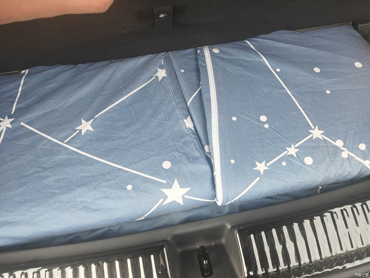 空间也是挺大,后排放倒也是可以睡觉的,可以把床垫放到后备箱下面的格子里。