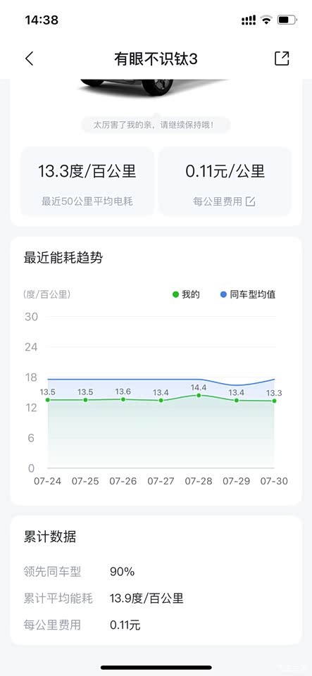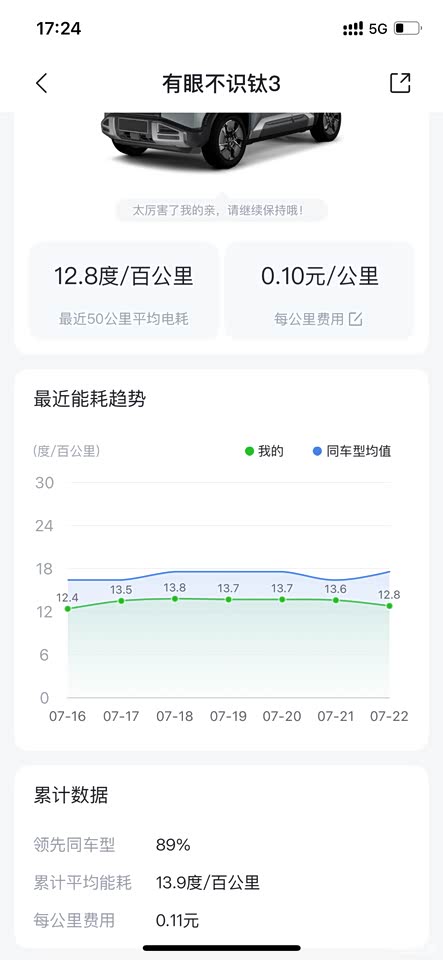 6月3日提车至今快两个月啦,市区代步通勤,已陪我跑完2815公里。个人很喜欢钛3的前脸和造型,星际战舰的设计还是很帅的!每次在路边停车,都能引起不少回头率[机智] 【续航能耗】 平时上下班时速应该是在80-90公里每小时左右,冷风和音乐基本常开,百公里13.9度的电耗,每公里0.11元的使用成本。如果只是听歌,不开冷风电耗13.3左右。100%到11%,385km的里程,这也是我第一台纯电车型,这个电耗还是大家评吧[捂脸] 【空间表现】 前后排空间只能说还可以吧,家用够了!要说缺点,那绝对是后备箱空间小,不过给了前备箱,也可以了如果对后备箱空间要求高,经常出去玩儿,放大件物品的,可以直接上豹5豹8系列。 【充电时间】 八九天充一次电,平时在4s店充,但是充电桩功率小,充满也得一个小时。在外面冲过一次,从25%-100%,用时46分钟!30%-80%速度确实很快,没得说!虽然工况显示501km续航,但实际充满表显都不止501km,快充充满表显513km,最近一次慢充11%-100%,7kw功率桩子,9个小时充满,表显524km[我想静静][我想静静] 【智能座舱】 内饰挺用心的,很有质感,而且后腰有支撑也很舒适。前排座椅通风加热很nice,夏天偶尔也会开一下,腰不好的就别硬吹了[呲牙] 同价位同类型suv里,目前没觉得有对手! 个人还是比较推荐的,市区代步通勤,对空间没有硬性要求的,完全可以入手。