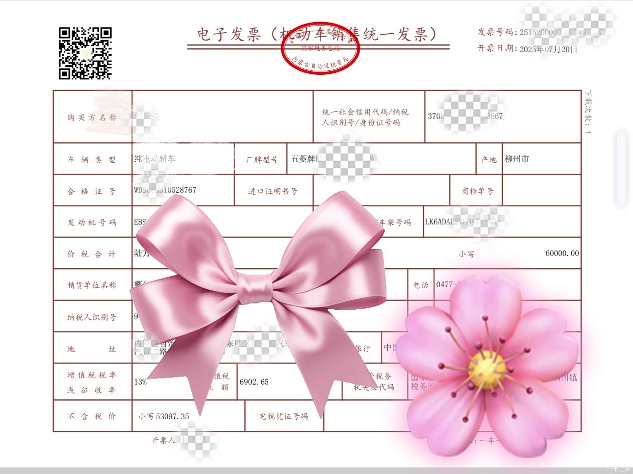 6万买个“带娃神器”,还行,原价60800,优惠了5000,置换补帐号5000,老公找的人,又给便宜一点,到手6万,另外还的国家给的15000补帐贴,要材料审批通过后再返给。如果到手的话,算下来才45000。保险3700,挂牌130元。对比过同价位的小车,缤果是四门车,空间比两门车大,还是五菱这种老牌子,售后网点多,老公说“就算我开坏了,修起来也不麻烦”。对我们这种单靠老公赚钱的家庭来说,花6万解决带娃出行的大问题,可以说是很值了!