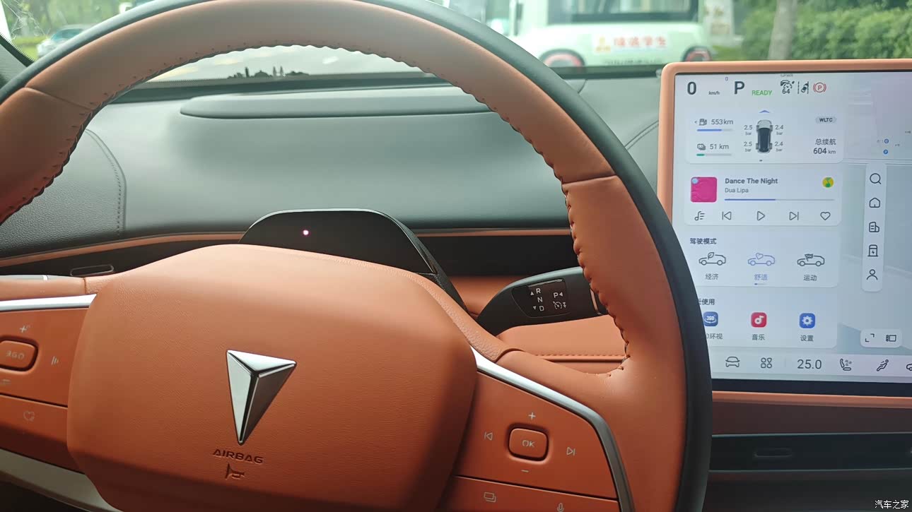 1. 座椅体验 前排:座椅舒适性OK,但是仍然建议购买头枕,久坐3小时无明显不适感。 后排:空间比较OK,但是中间因为是变形扶手箱的问题,偏硬,短途应急可接受,长途需换座。 NVH表现 城市路段:时速60km/h以下,电机声和胎噪几乎隔绝,车内对话清晰。 高速路段:时速120km/h时风噪明显(无框车门设计牺牲部分静谧性),但音乐音量调至40%可覆盖。 增程器介入:馈电状态启动时,方向盘轻微震动(类似油车启停),噪音比燃油车低很多,但对比纯电模式能感受到噪音。低电量启动时声音较大,但是也可以接受。 底盘滤震能力:过减速带时确实偏软;连续烂路车身会晃动,后排乘客易晕车。建议拉人的时候平稳驾驶。 AR-HUD 显示清晰度:显示清晰,导航箭头准确,复杂路口指引精准。 自定义功能:支持车速、车道线、娱乐信息三档显示组合,个人偏好主题三,有歌词显示。