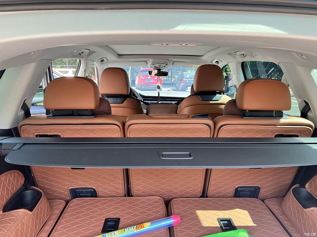 空间方面,肯定是够用了,尤其当五座车使用时,完全不用担心。3米长的轴距,1.97米的宽度让二排做三个成年人也很轻松。而且二排座椅靠背可以手动调节,虽然比不上新能源的二排舒适性,但家里人坐在后面都说舒服。中间地台凸起不算高,平时也基本不坐人。三排应急时可以,坐两个不高的成年人也OK,但不适合长途陆行。三排平时放到,后备箱空间巨大,平时出去露营、烧烤,放行李、工具完全没问题。