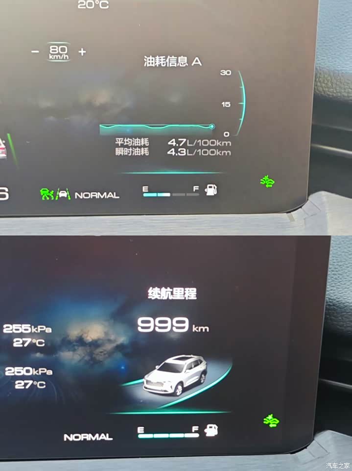 纯市区油耗不低,有时候开车路程太短或者堵车,表显油耗十几个都有,但不堵车时速跑到40以上,油耗就降下来了,根据车速大概 7,8个;80限速最低跑过4点几个,高速120匀速跑的话基本在6个多油。下面一张图是青海湖段限速80跑的A油耗和预估续航,第二张图是4500公里跑的B油耗。