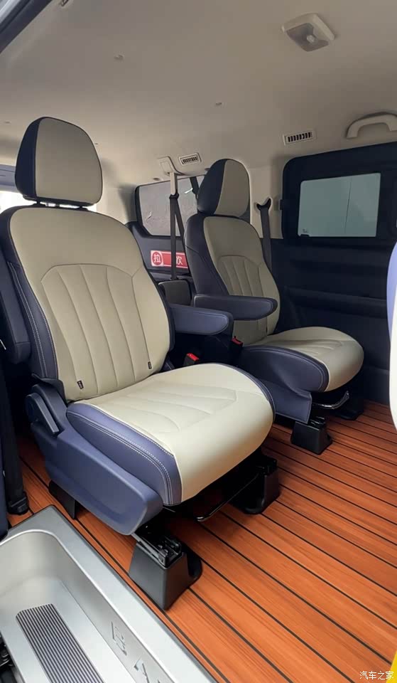 整车的内饰是蓝白双拼的,整个感觉简单干净一些清新明亮的感觉,内饰用料的话是皮质的座椅,而且这个座椅坐上去感觉很舒适特别是中排,像我们这种家里有老人的坐上去要舒适型有舒适型要空间有空间,家用开出去拉朋友去玩都感觉排面十足,感觉就是既能家用又能商务的那种感觉