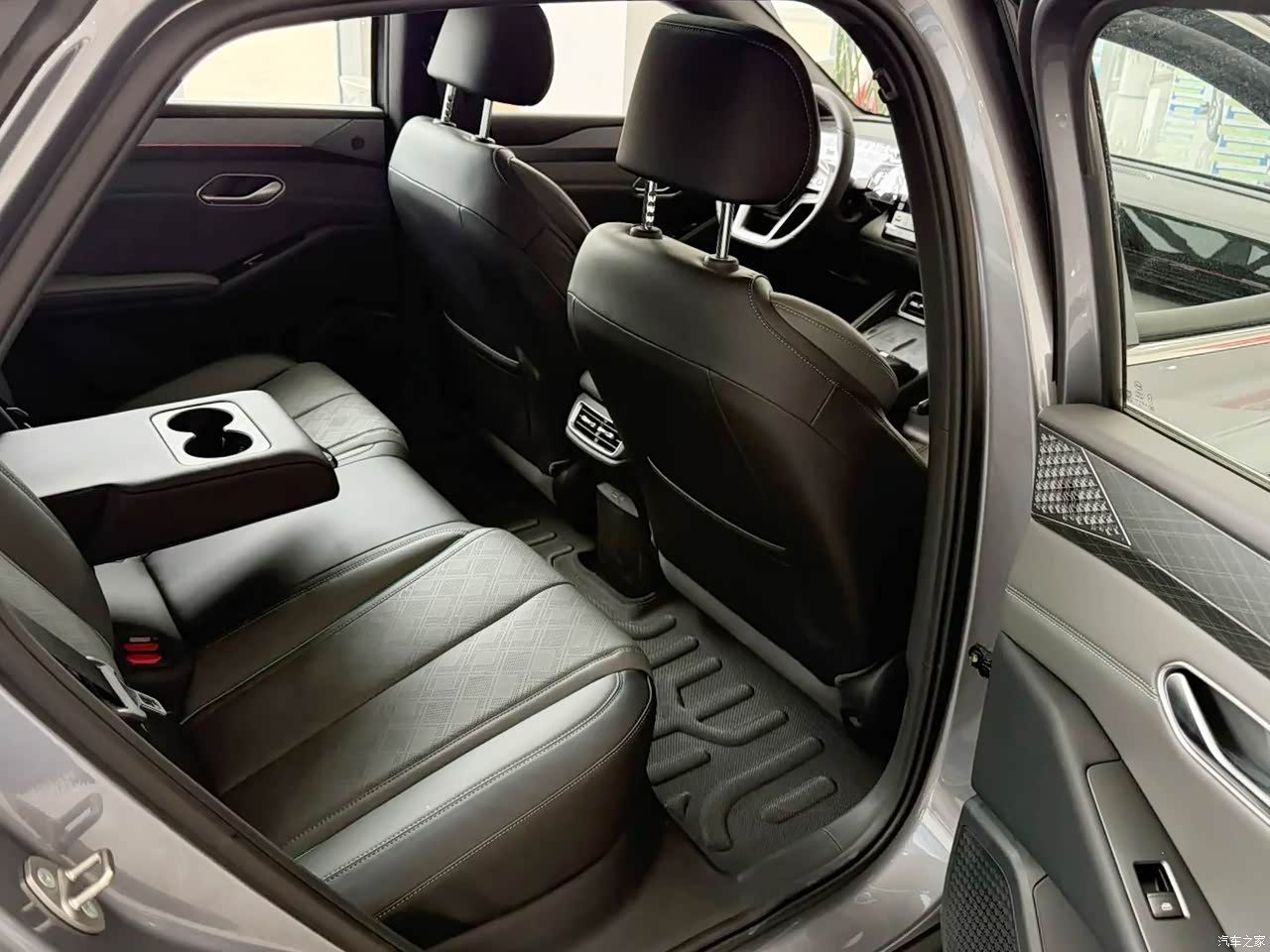 后排空间是最满意的点,坐进去膝盖还有两拳距离,地台纯平设计让中间乘客放脚很舒服。后备箱常规容积大,也能装下不少东西。储物空间设计很巧妙:中控台下有无线充电板,旁边的隐藏式储物格能放下物品,这些细节用起来特别顺手。