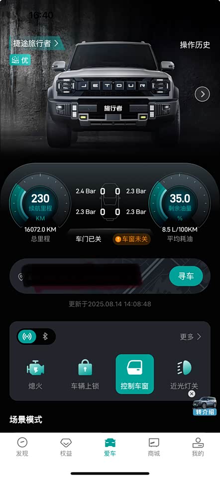 其实也不叫最不满意的地方,只是相对而言,油耗比较高(和我原来的1.6tSUV比较)(以后出门油费就是大头了😂)。其实也不算高了,打个比方就是说,比一般城市2.0T的SUV稍高一点,因为他是方盒子车型风阻大。比硬派越野车低,它没大梁车轻一点。上面的图里有一张是油耗的,显示的是8.5升每百公里,实际要更高。这主要是是高速和国道跑出来的(均速在60以上)城市里实际至少十个十一个以上的油了。 再加一条:每个车窗的上升下降逻辑不符合人的要求: 1、远程控制部分 只设置了全车通风(20%开度);全车关闭;80%开启三个选项,不能自定义。 2、停车后,锁车全车窗户关闭,车窗没有其他位置选项,而且不能单独控制每个窗户的开度(锁车后)。露营时需要透气的时候很不方便,希望软件升级后能改进!