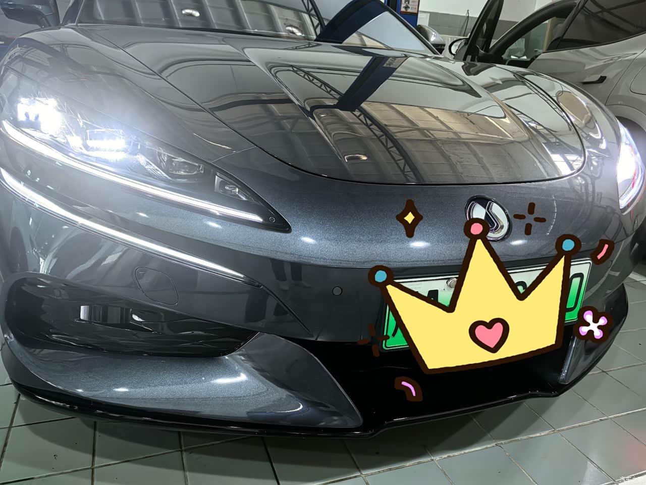 在我选N9的时候,在店上就无意看到这台灰色的,就觉得这个颜色还挺好看的,我女儿主要是很喜欢这个车的造型,觉得很运动,很帅,为了兼顾我们也可以开,所以就选了偏行政一点的Z9,繁星灰色,很高级,很亮。其实黑色也很好看,但是女儿用太成熟了