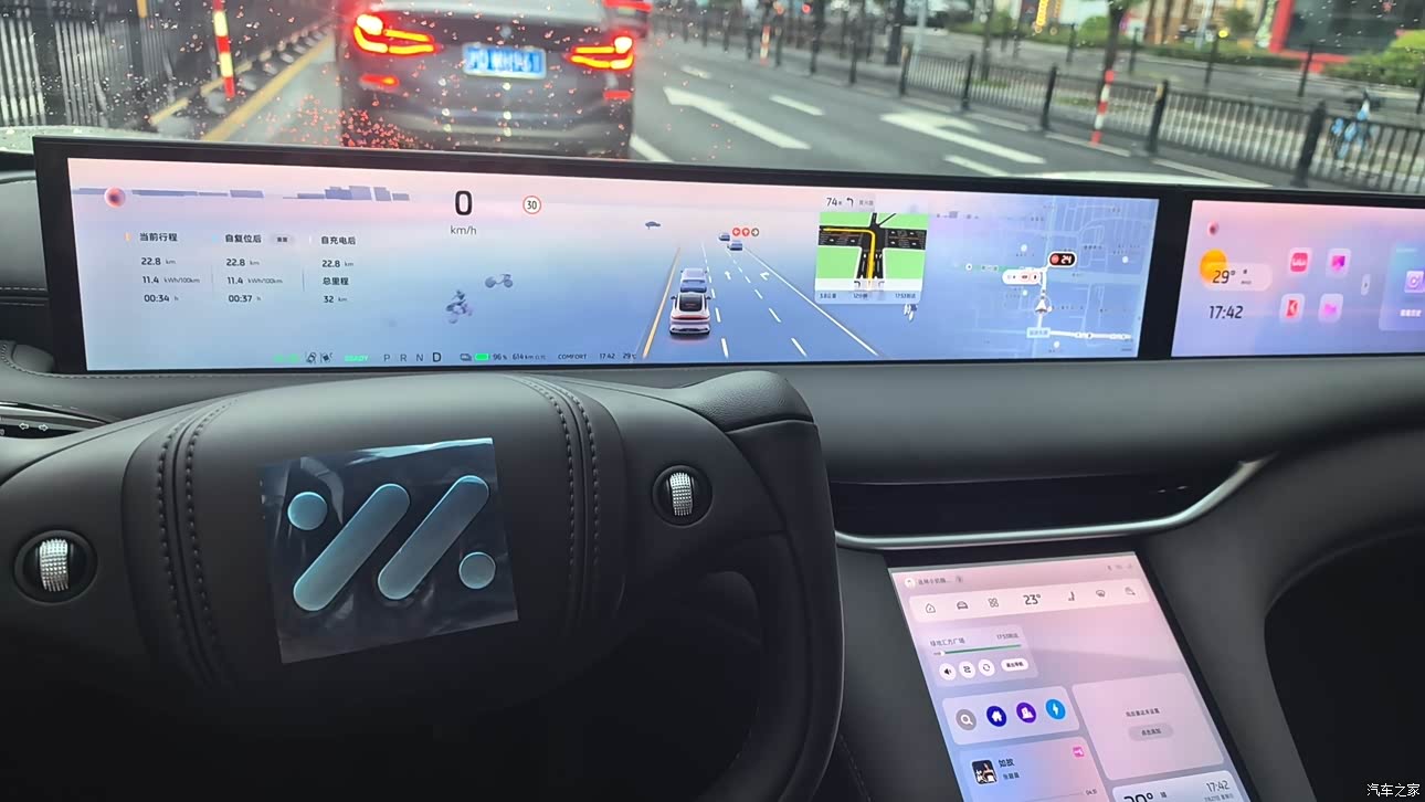 驾驶:驾控首先半幅方向盘,我一上车就适应了,真不夸张,有人说开一两天或者一个星期;我就是一试驾我就觉得一点问题都没有; 开了这几周以来,反而还适应了半幅,觉得很轻松;现在开回全幅的车,反而觉得有点笨重;操控也不用多少,毕竟那个配置在哪里,我这块是智享版,带空悬的,刹车几乎没有点头,车子很好控制