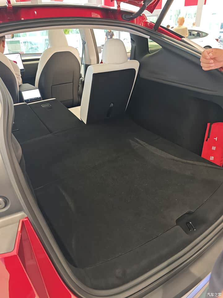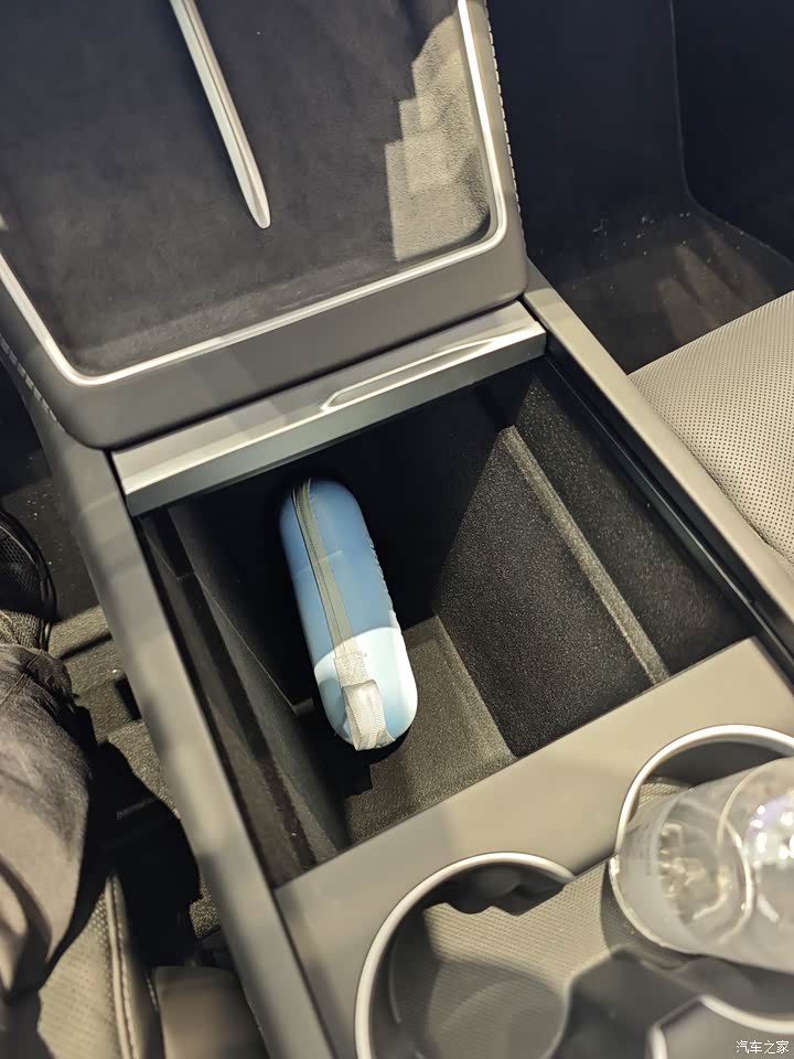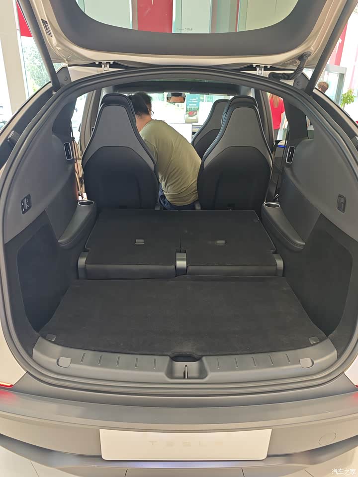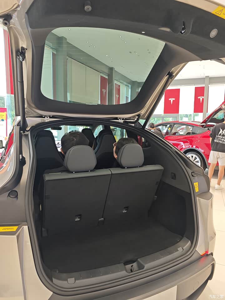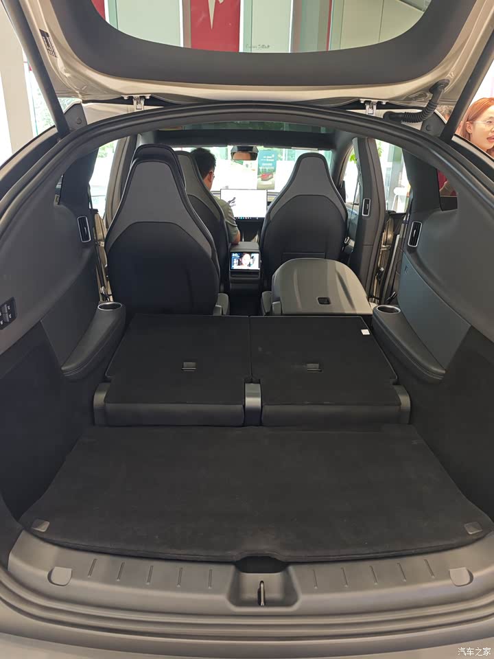 内饰依旧毛坯房,简单直接,一切从简,中控那储物地方很大,能装不少小东西,包括前后备厢也很大,能装不少东西,后备箱盖板还可以磁吸到三排靠背上,细节好评。 然后座椅依旧特斯拉,深色好处耐脏,适合不爱打理车的用户,还有后排座椅头枕可以上下调节,这个还不错,挺方便。