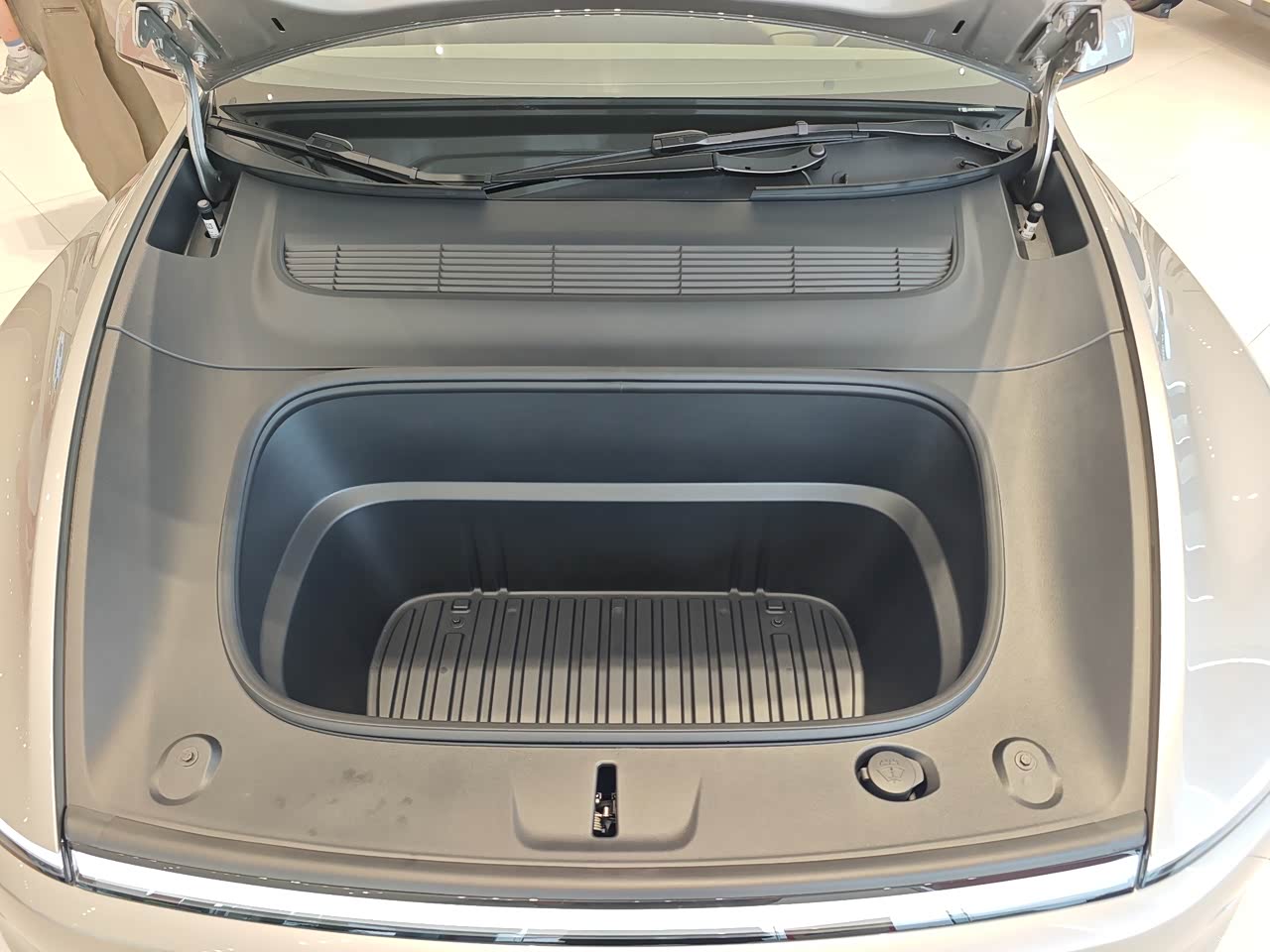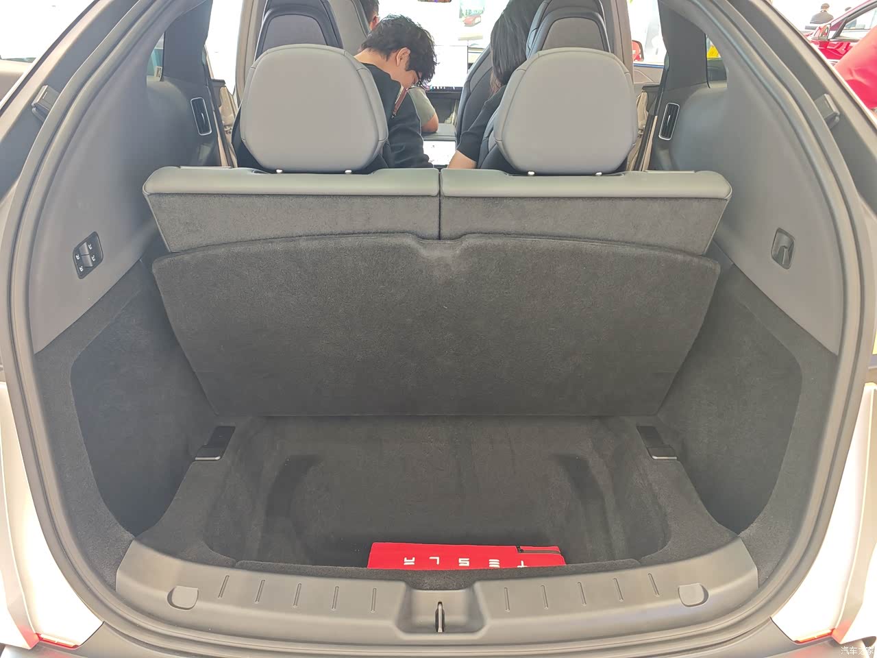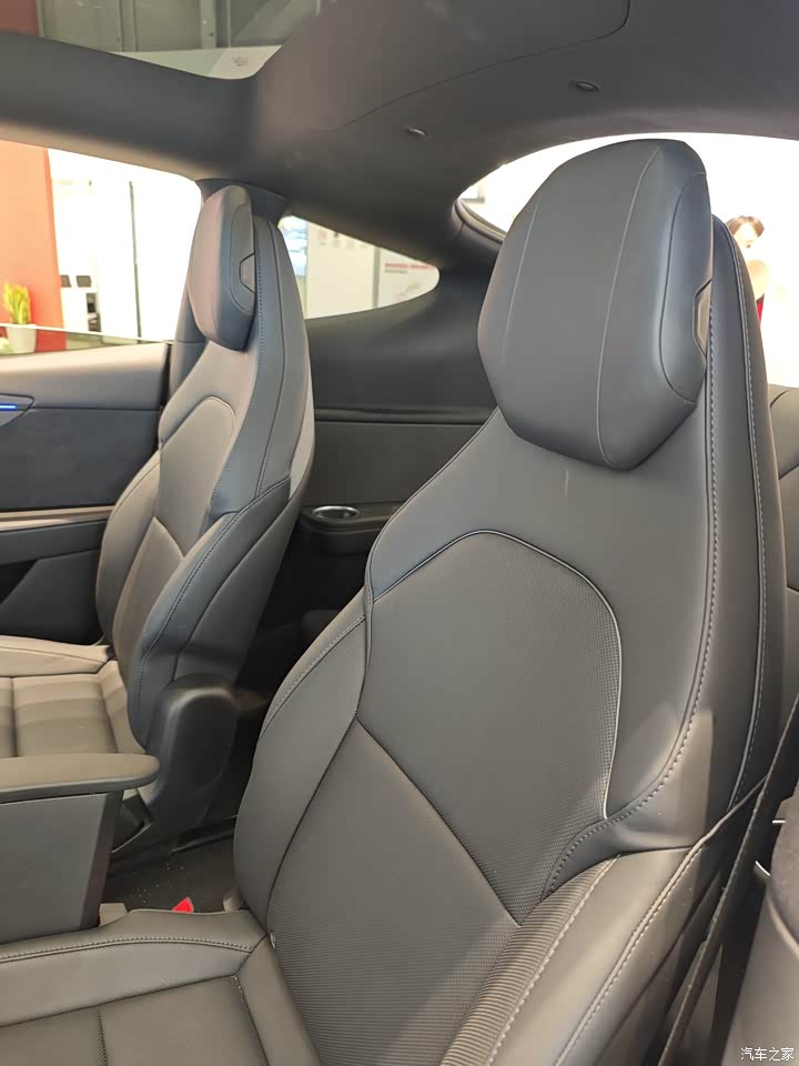 内饰依旧毛坯房,简单直接,一切从简,中控那储物地方很大,能装不少小东西,包括前后备厢也很大,能装不少东西,后备箱盖板还可以磁吸到三排靠背上,细节好评。 然后座椅依旧特斯拉,深色好处耐脏,适合不爱打理车的用户,还有后排座椅头枕可以上下调节,这个还不错,挺方便。