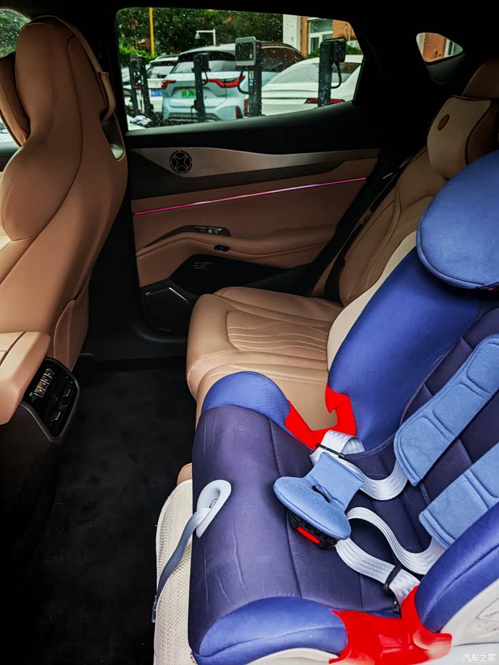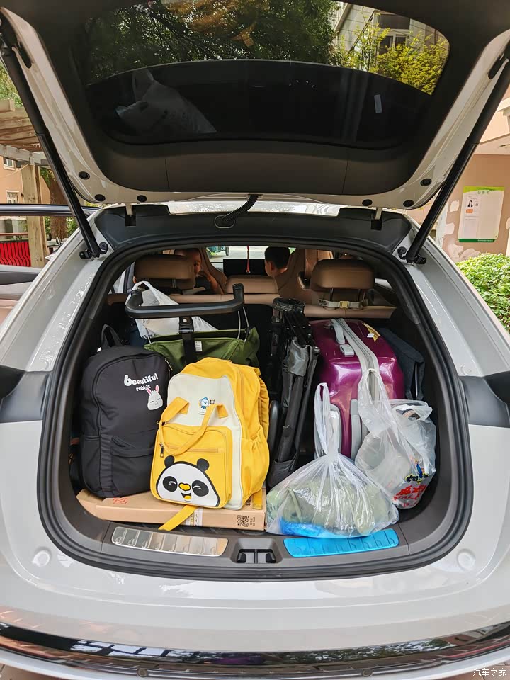 不到5米的车长,2940mm的轴距确实非常棒。无论是前排还是后排,腾势N7的头部和腿部空间都相当宽裕。调整好标准坐姿后,头顶还有约两拳的余量,坐在后排时膝盖距离前座也有两拳以上的空间。不仅空间宽敞,储物能力也非常好,前备箱+后备箱特别能装,帐篷,行李箱什么装下没问题,后排也可以放倒,那就更能装了。后备厢在正常状态下容积为480L,能够轻松容纳两个24寸和一个28寸的旅行箱。将后排座椅放倒后,容积可扩展至1200L。最满意的是后排地板也是纯平的,这让后排中间位置的乘客也能获得舒适的脚部空间,不会感到局促,长途旅行毫无压力。