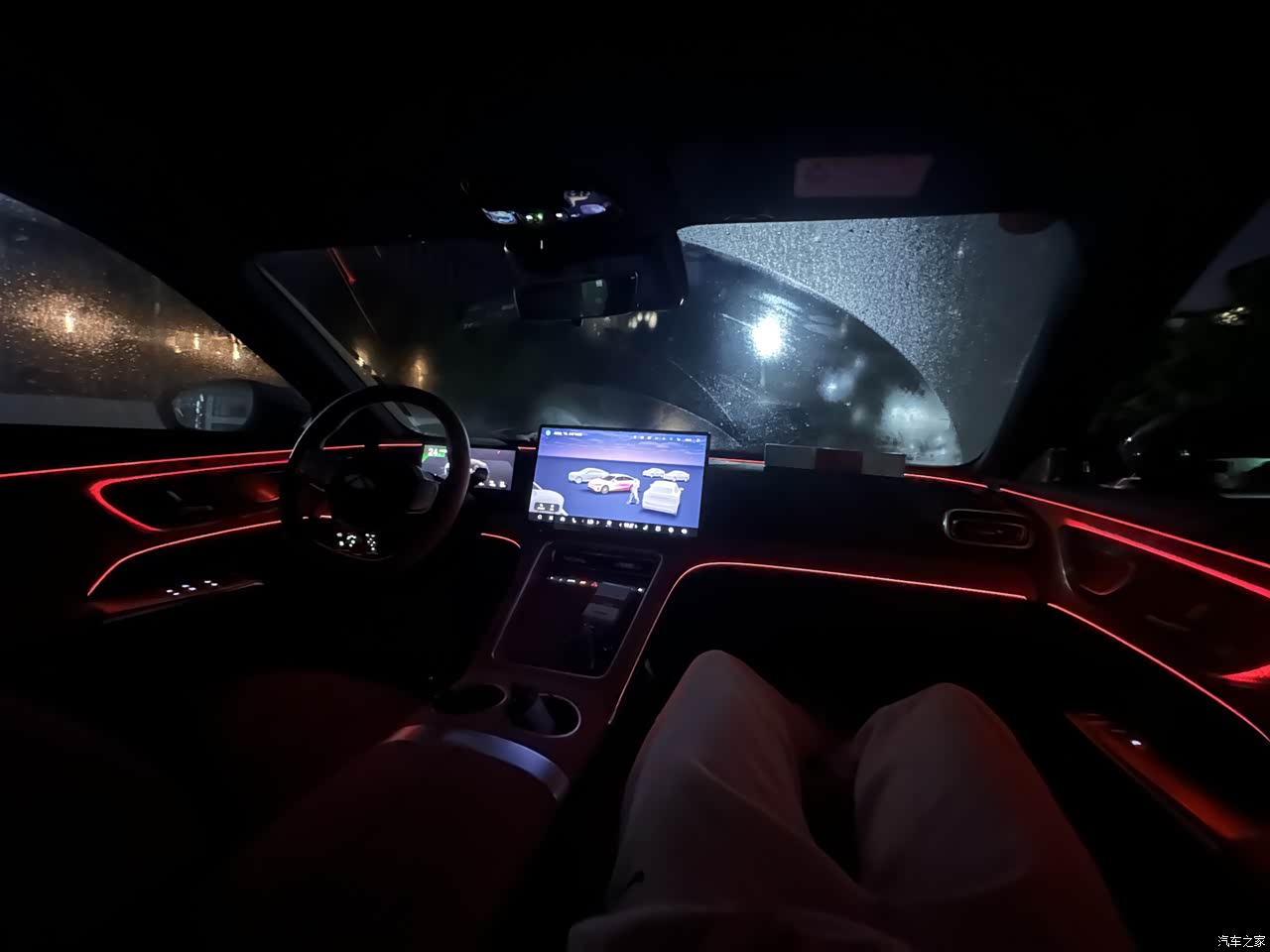 内饰用料超出预期,中控台大部分区域是软质包裹,缝线做工整齐,没发现明显瑕疵。晚上开氛围灯颜色柔和,不会像有些车那么刺眼。储物空间设计贴心,前排扶手箱能放下我的14 Pro Max加无线充电板,门板储物槽还能塞下1L的水,还有一个专门放雨伞的地方
