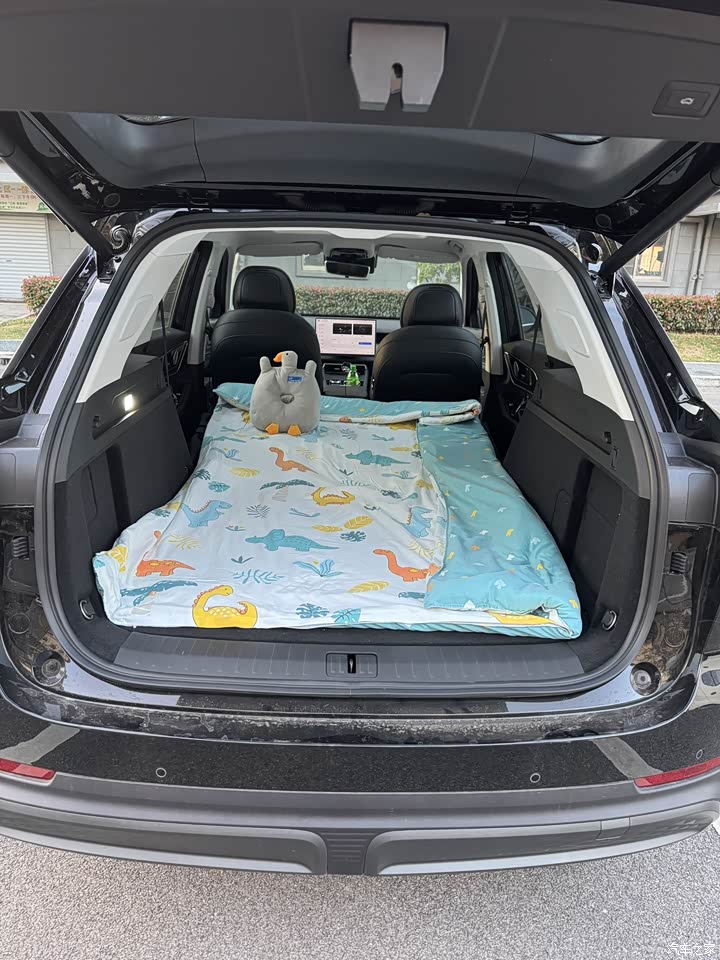 后排空间很宽裕,跷二郎腿完全没问题。后备箱也特别能装,之前和四个朋友去黄山,行李全塞进去还有空。后排放倒直接能当床,我没买专用床垫,铺个褥子就够用,这空间轿车真没法比。