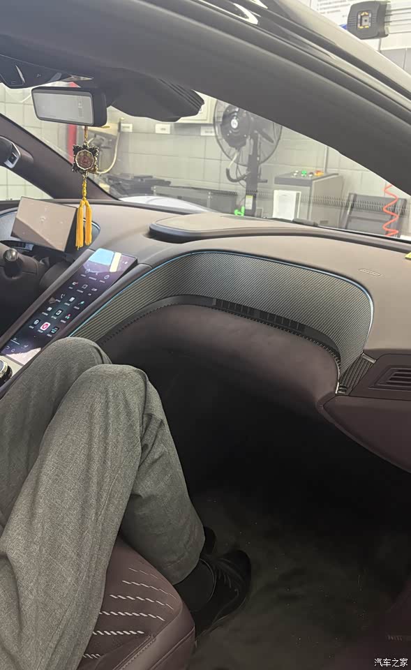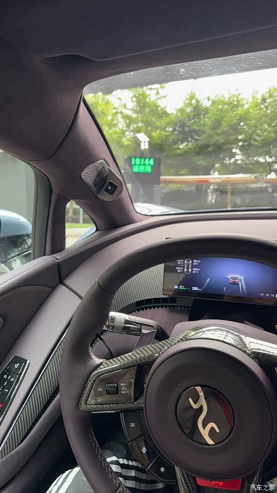我没有怎么拍我的内饰,所以在网上找了一张比较直观的图,我选的是紫色的内饰,我本人也是很喜欢紫色的,所以我的车子外观选的是阿盖尔紫内外统一,我觉得看起来很神秘,也很尊贵。坐进车内,大面积的碳纤维装饰和麂皮全包覆,酷。环绕式氛围灯,会随着驾驶模式和音乐的变化而改变。