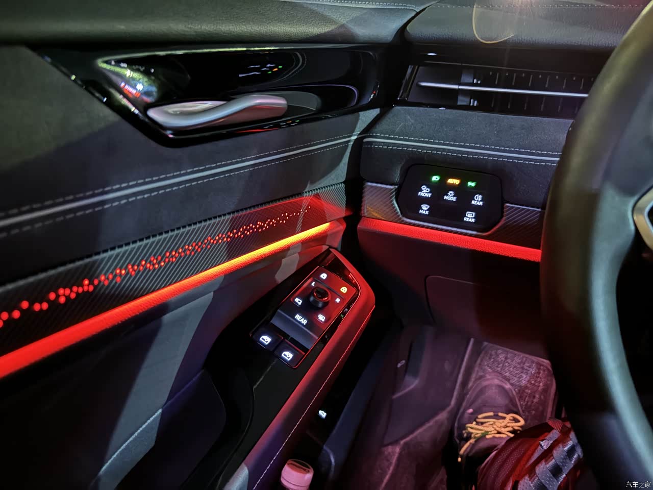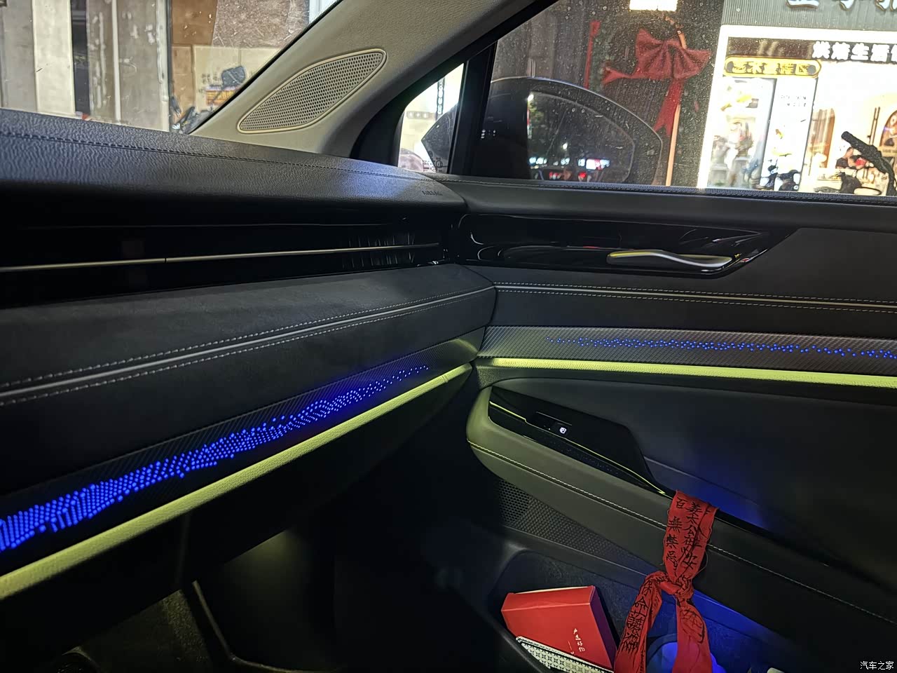 内饰做工用料方面还是很不错的,门板上采用一些翻毛皮设计,看起来比较高级,中控大屏,车内多色氛围灯设计特别好看,氛围灯可以设置上下层不同颜色,氛围感满满的。