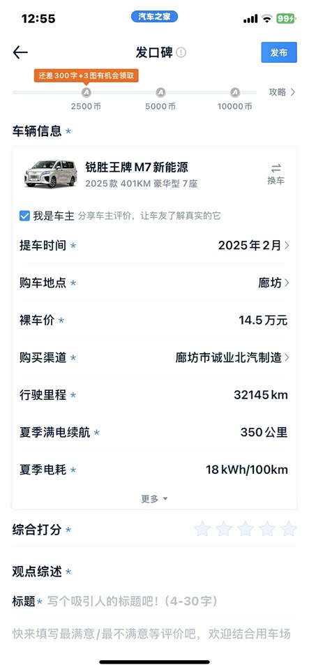 最满意 满意就是它大气的外型、超大的空间、和外挂电源的方便,还有就是比油车省钱很多。我干的就是短途客运,每天从县城送学生到市里上课放学在接回县城。以前的太久了想着趁着有政策换个电的7座车。想买电车也是为了省钱这很重要。我就在网上和直播上看了很多品牌的车又去4S店试驾了很多次,经过多方对比,我选择了锐胜E-M7七座纯电车。 当时多次到4S店看车试驾销售小哥细致又专业,买车时工作效率也高当天就把保险、临牌一切手续都弄好了。