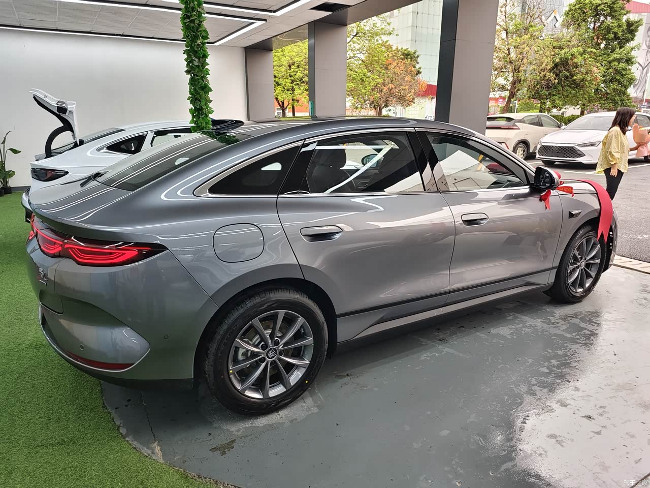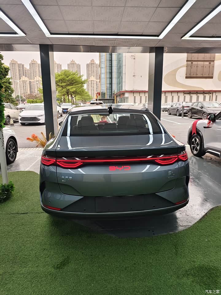 总的来说,这车头的龙颜设计,直接把车的颜值拉上去一个档次!从侧面看,跟秦L DM-i比着,总觉得短了一块儿,其实就是车尾那儿少了一截。再看屁股,造型还挺张扬。瞅着车尾下面有俩通风孔,其实就车头下面那俩是真能用的,屁股上这俩纯纯是装饰,压根没通风的用。还有尾灯,相对来说挺简单的,不像比亚迪汉是四个中国结、秦L DM-i是三个,秦L EV的尾灯一边就俩中国结。