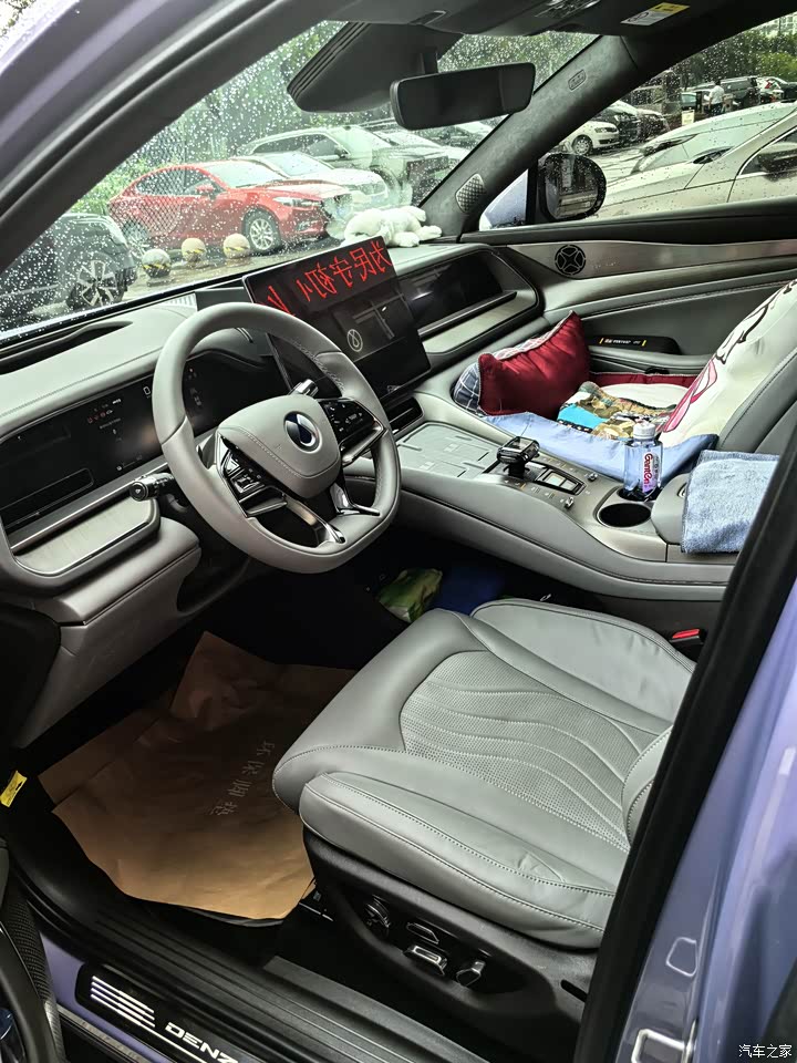 内饰方面,可以说是我和家人最终决定买腾势N7的一个非常重要的原因。虽然很有人吐槽N7的内饰老登风十足,但是就是这个内饰完完全全长在了我和家人的心尖尖上,图片奉上,内饰这个只能看个人喜好了,喜欢的就会非常喜欢,不喜欢的那就怎么也喜欢不来。最后需要提一下,本来我想买凝脂棕的内饰,因为全国没货,最后买了烟波蓝。提车以后一点也没有后悔,因为这个颜色足够耐脏而且看着也很上档次,和灰色翻毛皮车顶颜色相近,不显杂乱,没想到烟波蓝给我们带来了意想不到的体验。