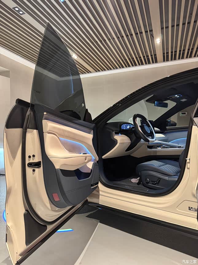 进入车内,极氪001的内饰用料令人满意,完全对得起这个价位。我选择的是蓝白拼色内饰,蓝色区域分布在容易脏的位置,实用性强又不失美观。全真皮包裹座椅柔软舒适,黛绿色内饰选项也非常有质感。