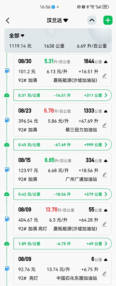 看我8月23号的加油记录,这次油耗是跑了近900km的高速公路,从广州往返了一样广西贵港暑假旅游,所以实测汉兰达高速是比市区道路运行多一些油耗。但加满一箱油确实可以跑一千公里是真的。
