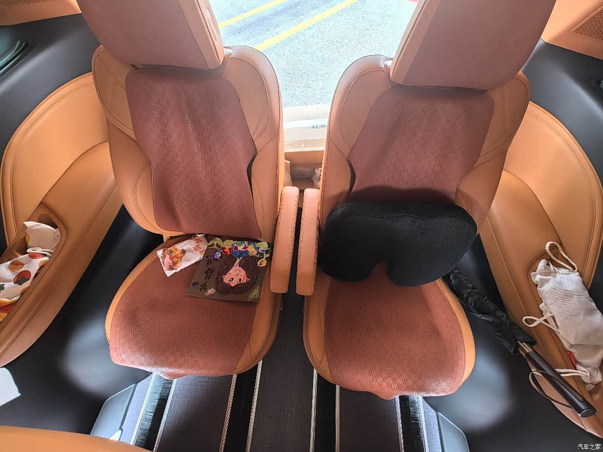 第二排是整车舒适性的“天花板”,双航空座椅具备多种调节功能,一键零重力模式让乘客仿佛悬浮在空中,舒适感无与伦比。座椅前方的仿皮包覆折叠桌板,方便乘客办公、用餐等。