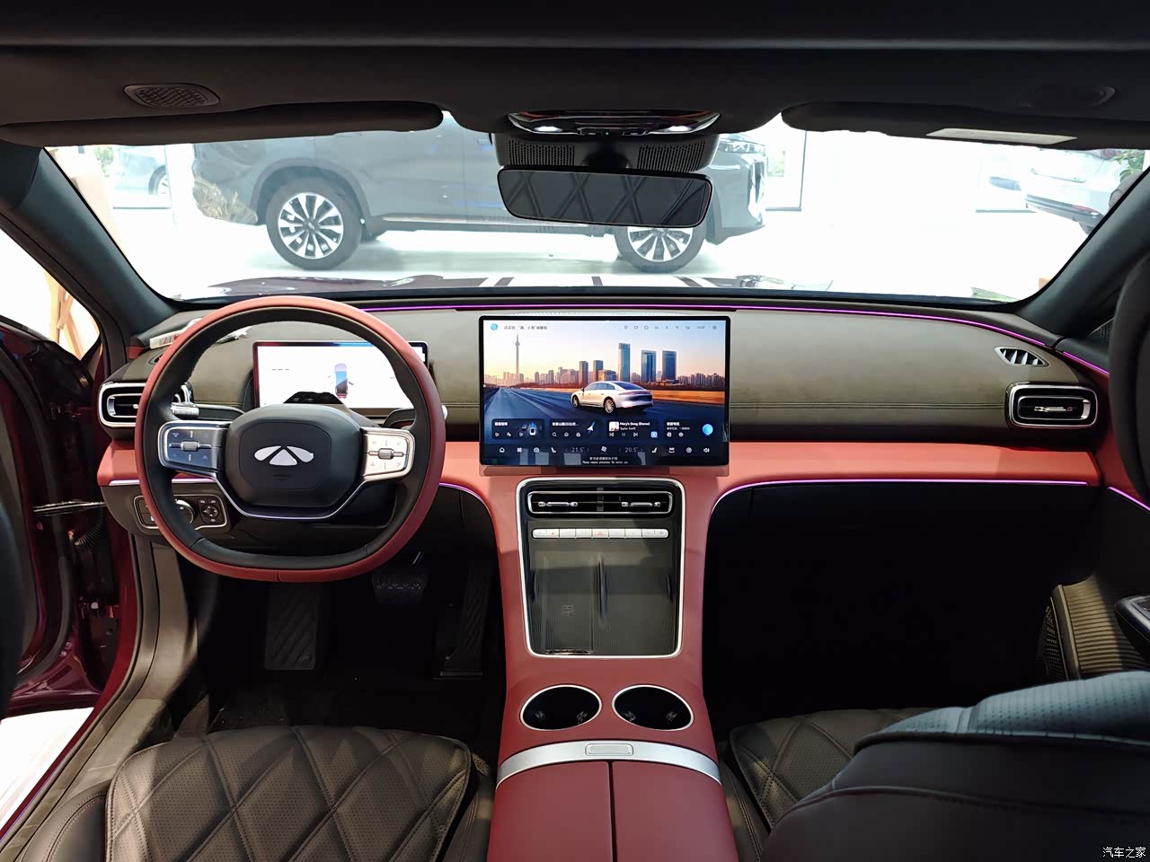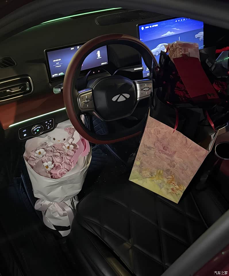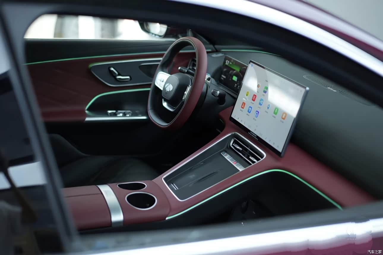 内饰当时是三种颜色一个是我买的黑红,一个白内和一个橙色,考虑白色不耐脏,然后橙色内饰感觉和我的红外不搭,后面也是选了四驱专属配色黑红色的内饰,整体氛围灯也炫,有三条灯带,比较遗憾的是少了个脚窝灯