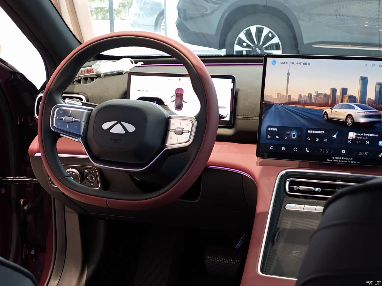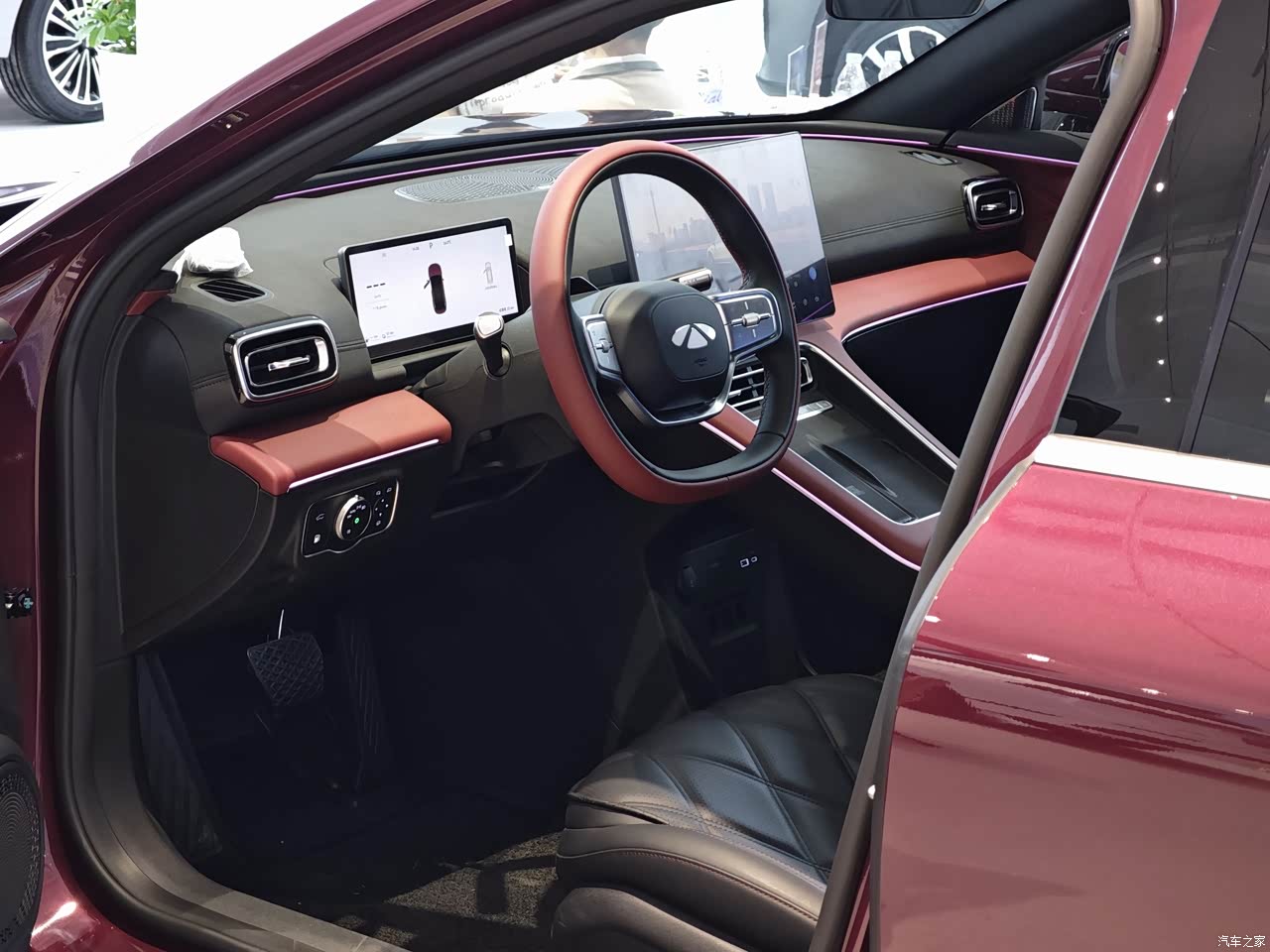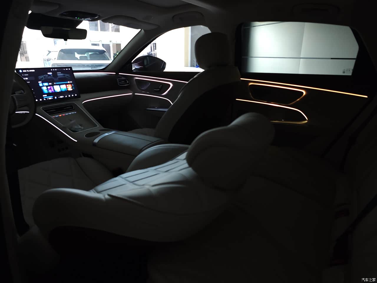 内饰当时是三种颜色一个是我买的黑红,一个白内和一个橙色,考虑白色不耐脏,然后橙色内饰感觉和我的红外不搭,后面也是选了四驱专属配色黑红色的内饰,整体氛围灯也炫,有三条灯带,比较遗憾的是少了个脚窝灯