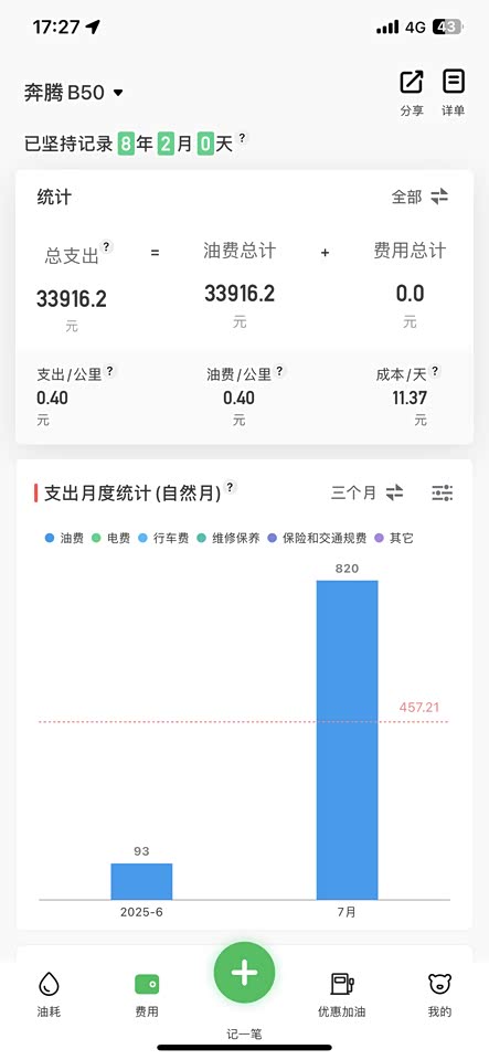 近100,000公里的油耗,我也非常的满意,这个车现在跑了100,000油耗综合油耗在综合油耗在7.5左右非常的棒!