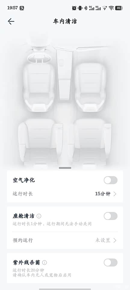 在车内没人的时间,打开空气净化和紫外线杀菌,让第二天的用车更加舒适健康