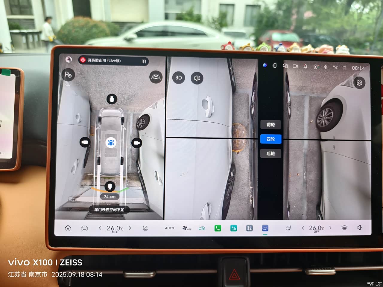 升级过后的360全景影像进行了调整,更加人性化了。主要第一360影像呈现清晰,倒车时显示倒车轨迹,同时显示左右后轮的实时影像,还有显示后备箱离后面障碍物的距离。让驾驶员更直观看到自己倒车的情况。 车辆在驶出停车位也有行车轨迹的显示,尤其在侧方位驶出时,更直接观察前车的情况。 最后我们停车之后,或者在驶出停车位之前可以通过360全景影像观察四轮的影像呈现。还有全车的3D影像显示,可以可以观察到盲区的实时情况。