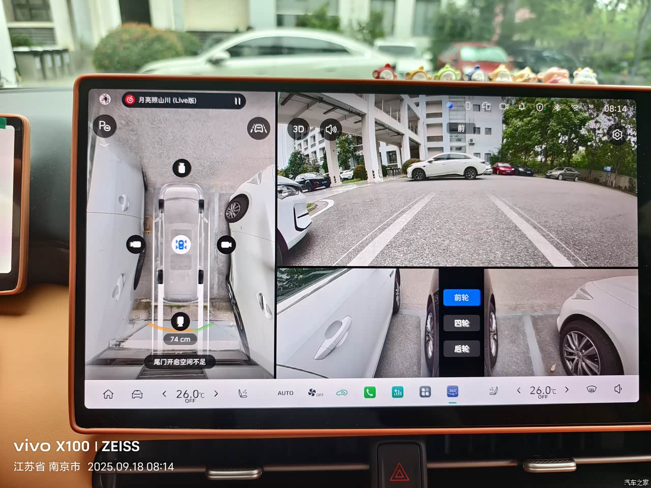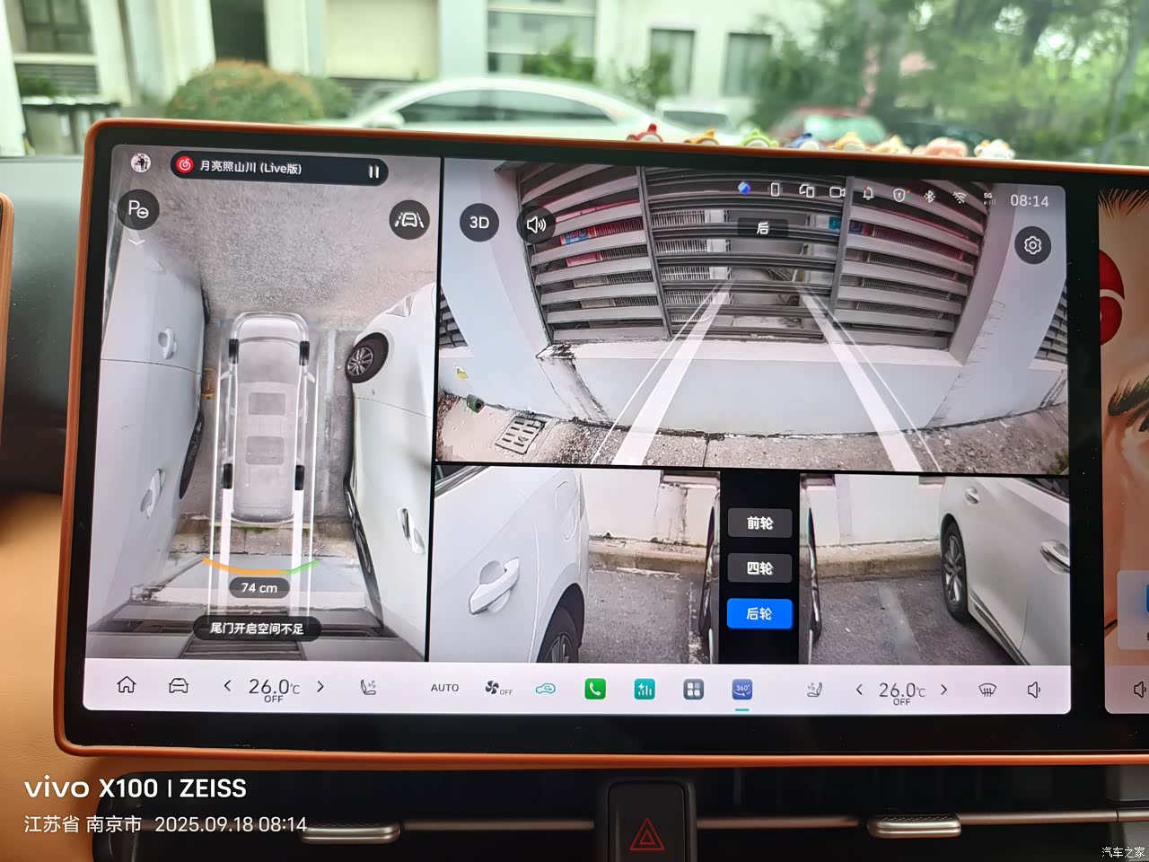 倒车影像,第一很清楚,左右后轮的显示,可以清楚观察到停车两边的真实影像呈现,同时显示后备箱门距离后障