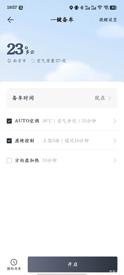 一键备车,可以在约定的时间段开启一键备车,打开空调和座椅的通风加热