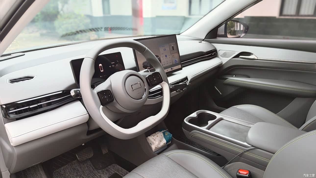 内饰走的是简约实用风格。两个大屏挺抢眼,塑料件多了点但手感不廉价 。中控台用了软质材料包裹,触感还不错。新车有点味道,散了好一阵。座椅是按人体曲线打造的,从腰到背贴合度很好,长时间坐着不累。浅色内饰营造出温馨的家居感。
