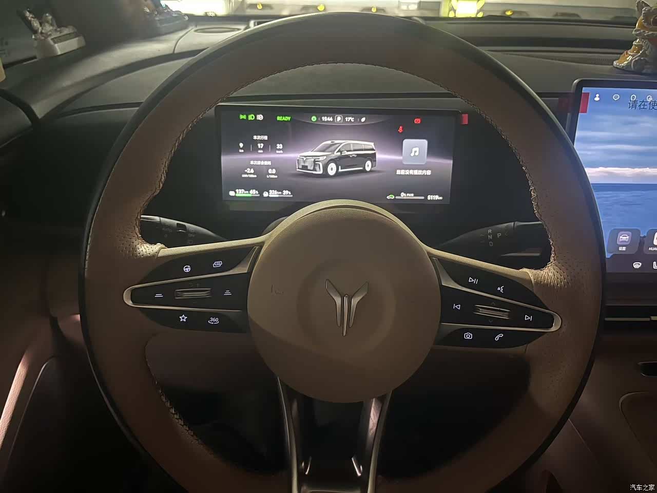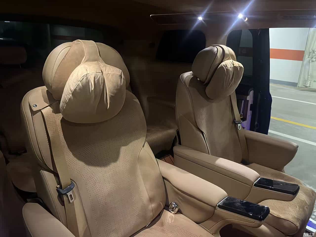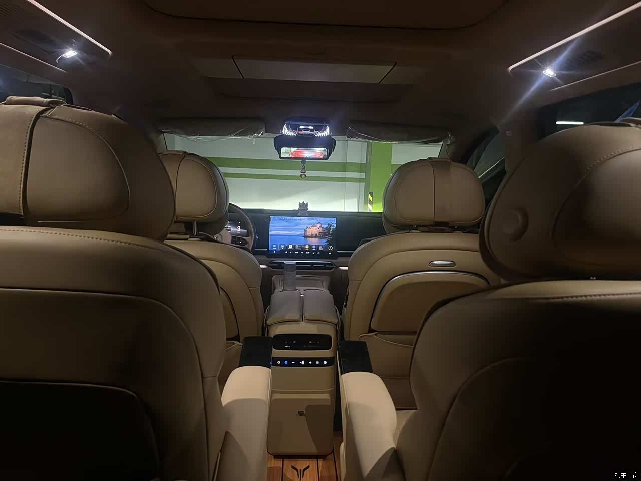 车里面的用料,驼棕色配着麂皮绒的车顶,整体看着有那么点豪华的意思,中控台是皮质和塑料掺着用,你仔细看就觉得有点掉价,方向盘那个接缝也不是很整齐,有强迫症的人看着不舒服,好在没什么异味,家里有小孩,环保材质用着也放心,座椅加热,通风,按摩都有,冬天坐着很暖和,后排还有小桌板和娱乐屏,小孩子看个动画片挺方便,就是副驾驶没给单独弄个屏幕,我老婆偶尔会念叨无聊。