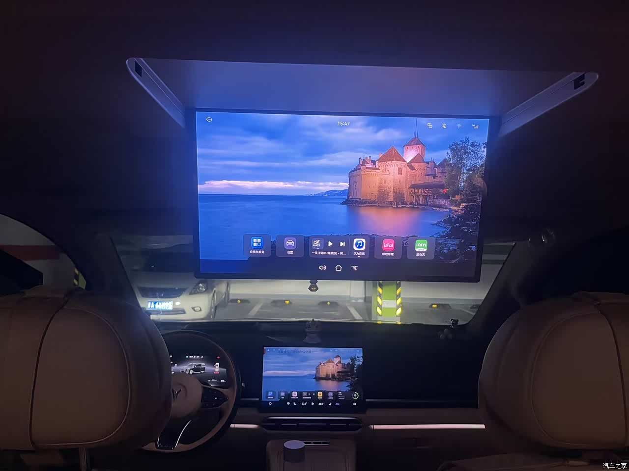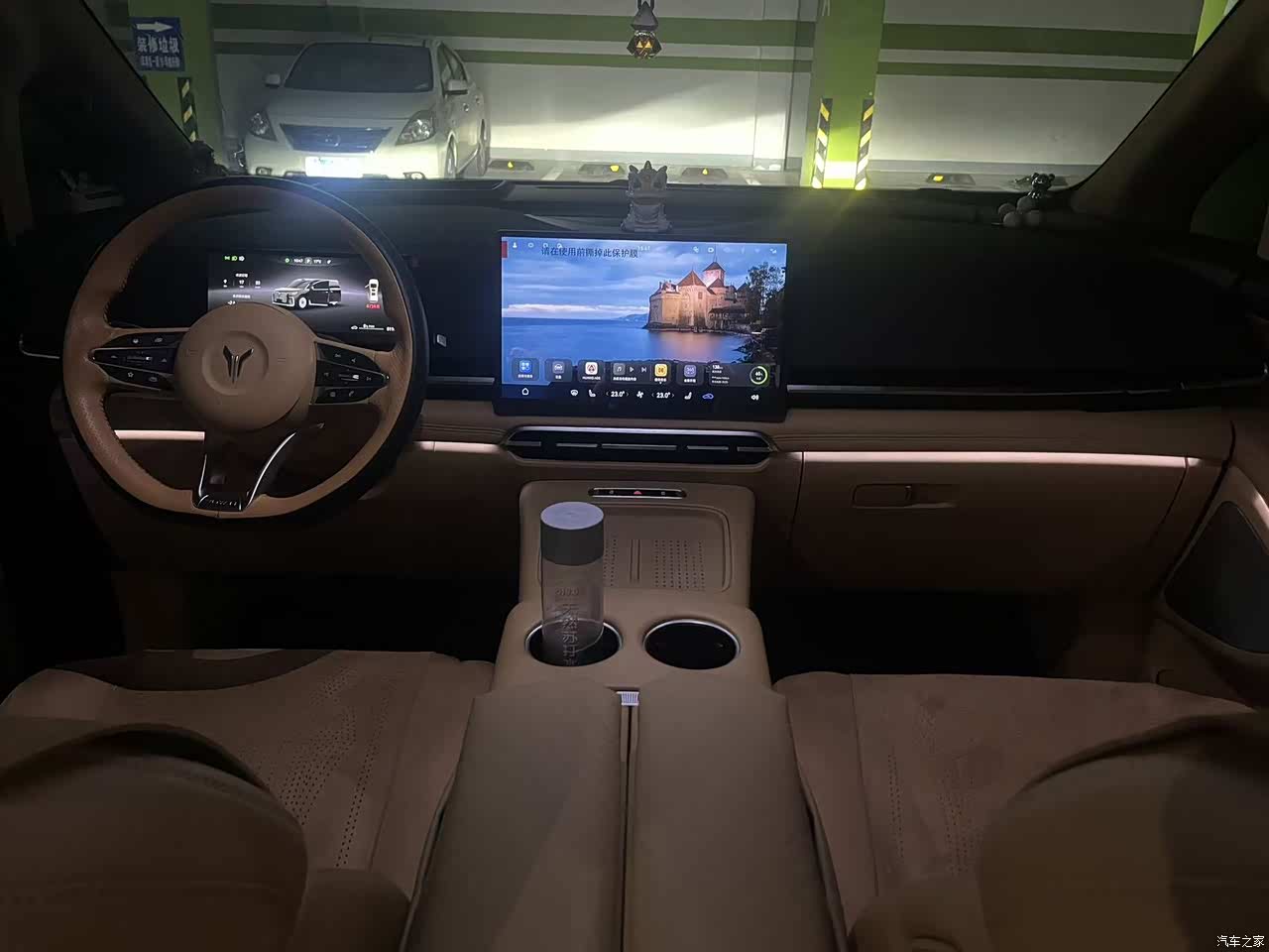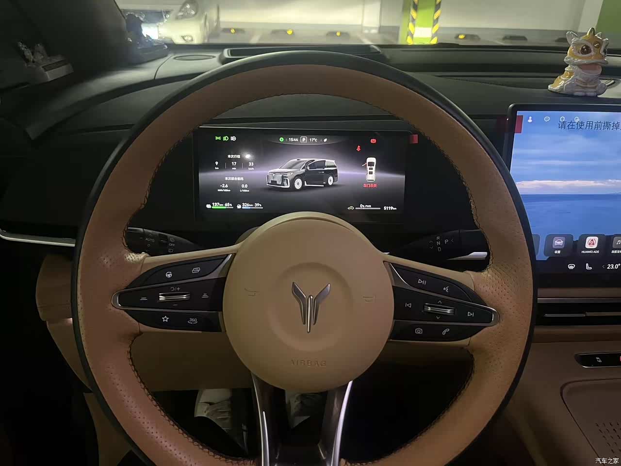 车里面的用料,驼棕色配着麂皮绒的车顶,整体看着有那么点豪华的意思,中控台是皮质和塑料掺着用,你仔细看就觉得有点掉价,方向盘那个接缝也不是很整齐,有强迫症的人看着不舒服,好在没什么异味,家里有小孩,环保材质用着也放心,座椅加热,通风,按摩都有,冬天坐着很暖和,后排还有小桌板和娱乐屏,小孩子看个动画片挺方便,就是副驾驶没给单独弄个屏幕,我老婆偶尔会念叨无聊。