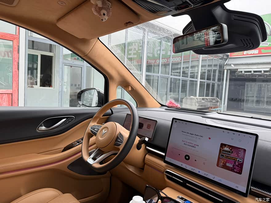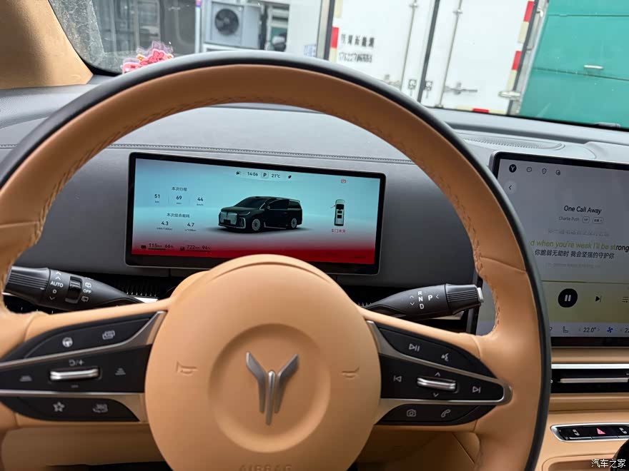 内饰 内饰是驼棕色,拉开车门,全是软包,手一摸就知道用料不差,座椅缝线挺细,双拼色设计也耐看,中控台布局清楚,按键用着顺手,两个悬浮屏很抢眼,仪表屏看得清,中控屏反应也快,操作起来流畅,还有个AR-HUD,导航车速直接投到前风挡上,方便安全,晚上把氛围灯打开,放点音乐,跟私人影院似的,副驾没给配个娱乐屏,我老婆坐着就觉得无聊,只能玩手机或者歪头看中控。