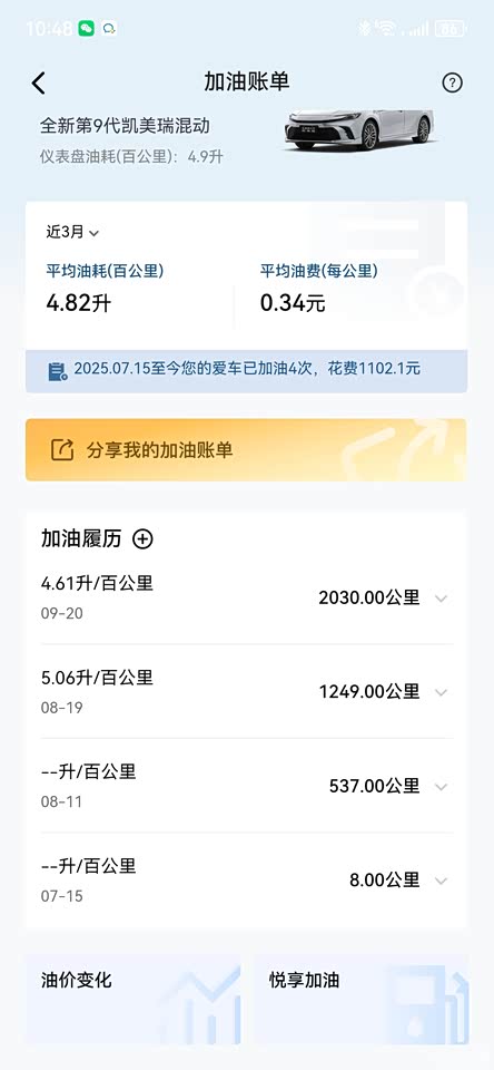 三个月油耗,表显八百多续航,现在一个月一箱油吧,昨天刚加的,没啥要求了,比油车省点,比电车弱点,比遥遥领先的增程😂😂😂