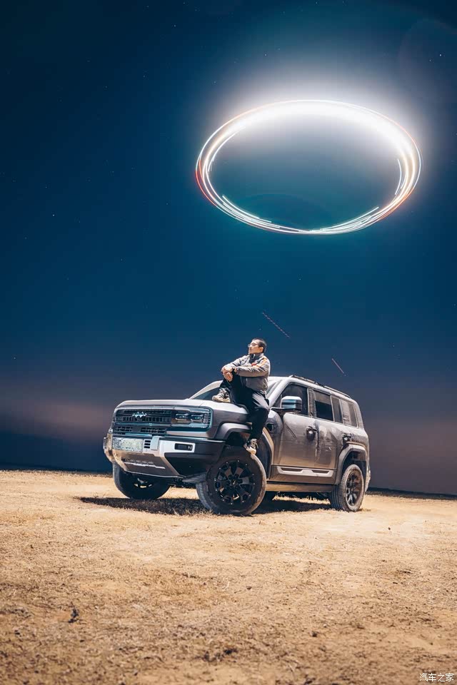 夜幕降临,山顶的风吹得格外清爽。我坐在我的豹5上,欣赏着这片宁静的夜空。无人机在头顶盘旋,它的灯光在黑暗中划出一道美丽的弧线,最终形成了一个完美的光圈。这个光圈就像是一个神秘的符号,将我和豹五笼罩其中。 豹五的深灰色车身在夜色中显得更加硬朗,那方正的车头和大轮胎仿佛在诉说着它的力量与可靠性。我坐在车顶,双手抱臂,感受着这份独特的宁静与冒险的氛围。远处的灯光和树木若隐若现,为这个夜晚增添了几分神秘色彩。 这个光圈不仅是一个光绘效果,更象征着我与豹五共同经历的这段难忘旅程。它记录了我们登顶的那一刻,也见证了我们的勇气与决心。在这个宁静的夜晚,我和豹五成为了山顶最独特的风景。