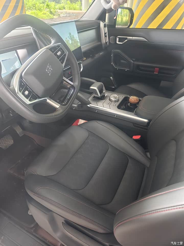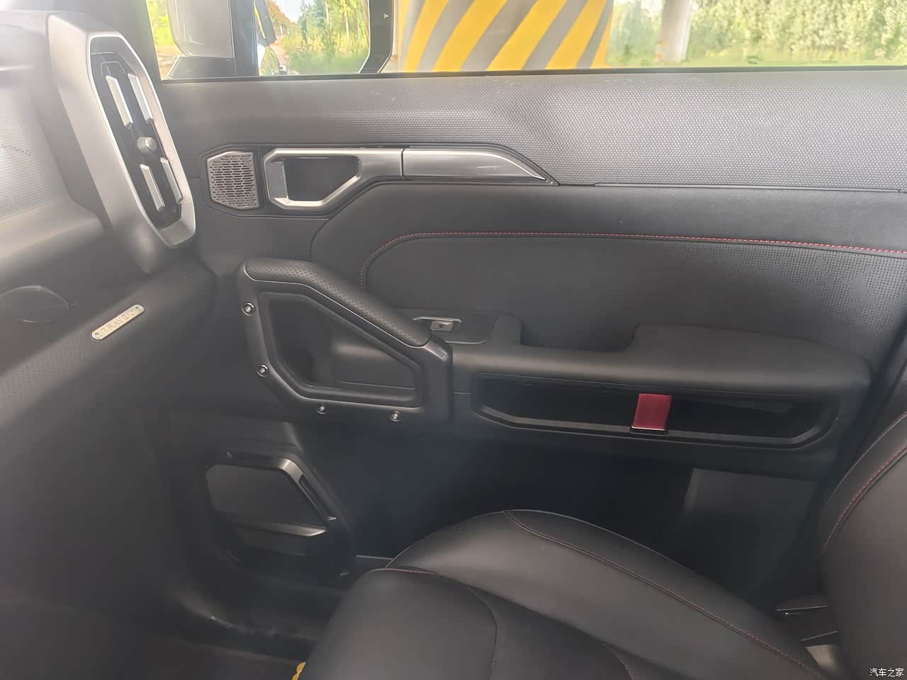 内饰部分就是跟简单,唯一我觉得好的就是很多把手跟细节硬核铆钉,音响罩显得很硬朗,没有氛围灯,音响也只有6个,实体按键也少的可怜,大部分功能都在车机上边,开车操作的话不太安全。