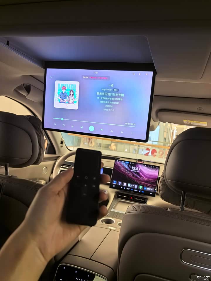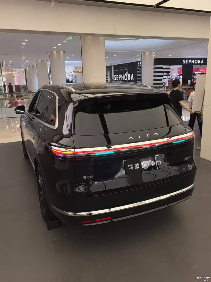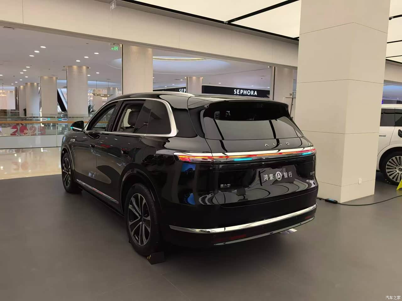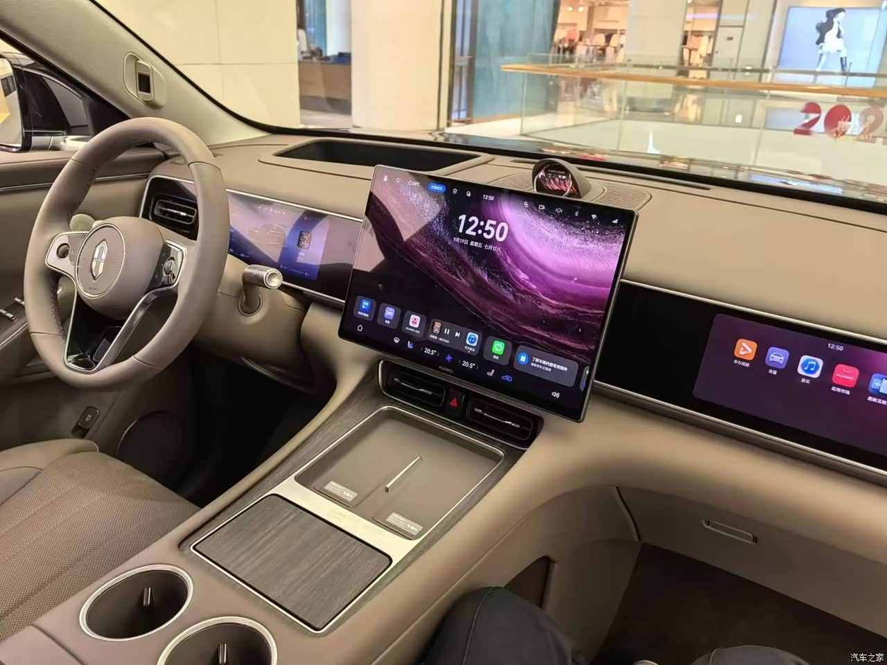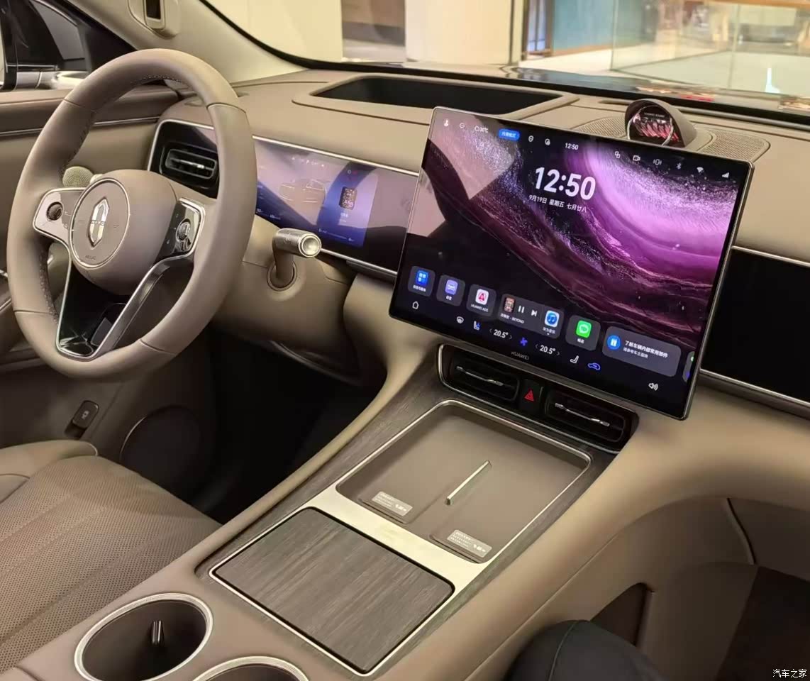 车内布局大气,材质细腻。中控大屏反应灵敏,UI 和华为平板的逻辑相似,用起来顺手。车门扶手和中控手扶都是软质包覆,长时间扶着很舒适。氛围灯光线柔和,与金属饰条和木纹饰板搭配得很和谐。